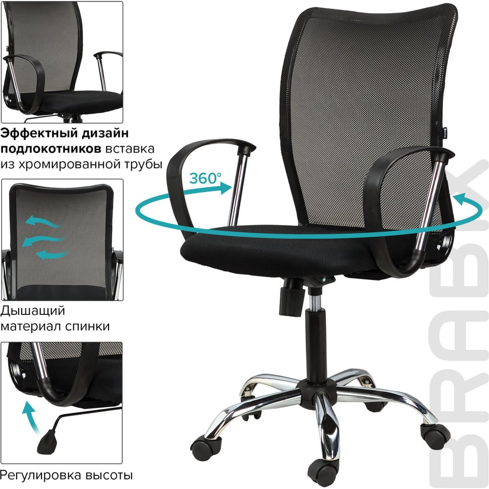 Стиль современный Регулировка высоты сиденья да Требует сборки да Подлокотники да Подъемный механизм да Механизм качания нет Регулировка высоты спинки нет Регулировка высоты подлокотников нет Механизм вращения да Подголовник да Регулировка наклона спинки нет Подставка для ног нет Max нагрузка 100 кг Ширина сиденья 450 мм Глубина сиденья 450 мм Ширина спинки 440 мм Высота спинки 540 мм Min высота сиденья 470 мм Мах высота сиденья 550 мм Цвет спинки черный Материал крестовины металл Материал подлокотников металл/пластик Цвет сиденья черный Материал обивки сетка/ткань Колеса есть Ортопедическое нет