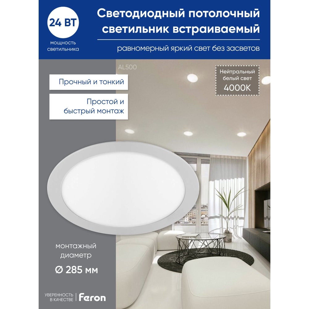 Светодиодный светильник FERON AL500, 24W, 4000К, 1500Lm, белый 28967