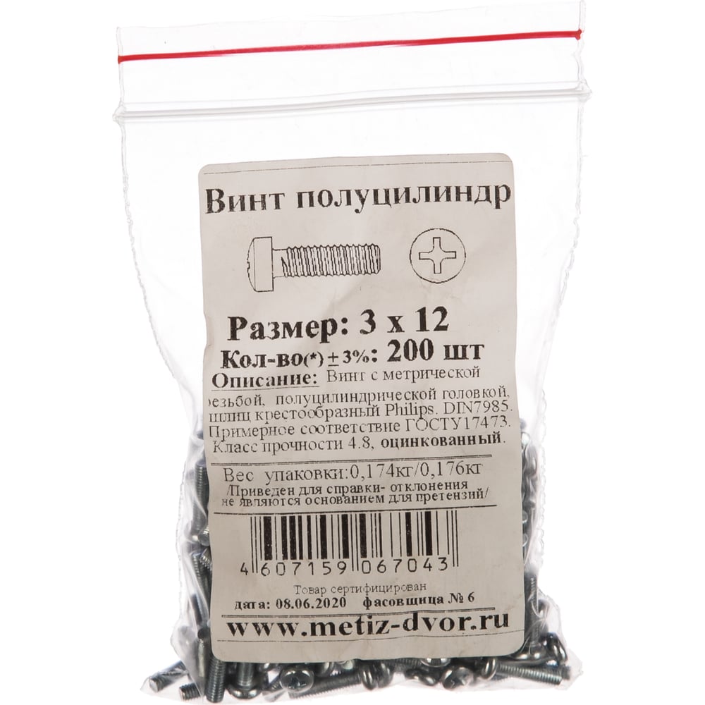 Винт с полуцилиндрической головкой Метизный двор 3x12 DIN 7985, 200 шт. 4607159067043