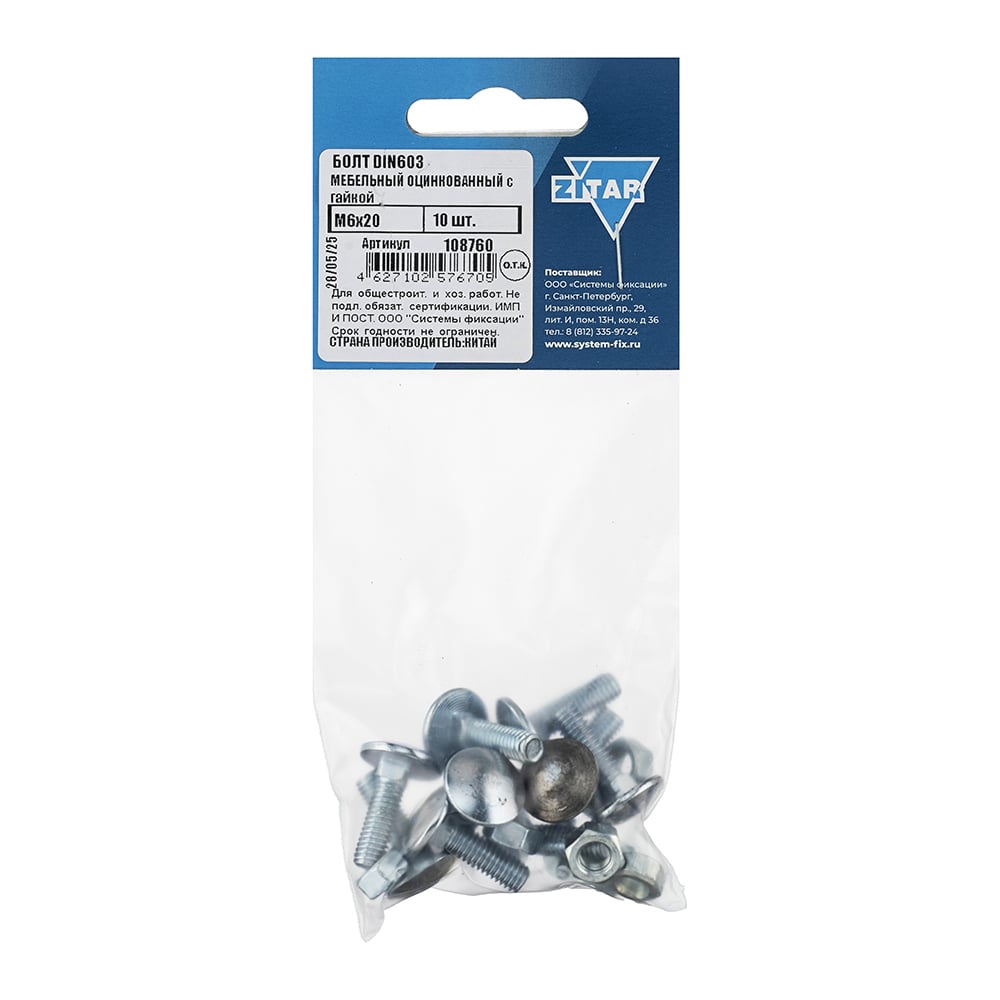 Мебельный болт DIN603 оцинкованный М6х20 с гайкой, 10 шт Zitar 108760
