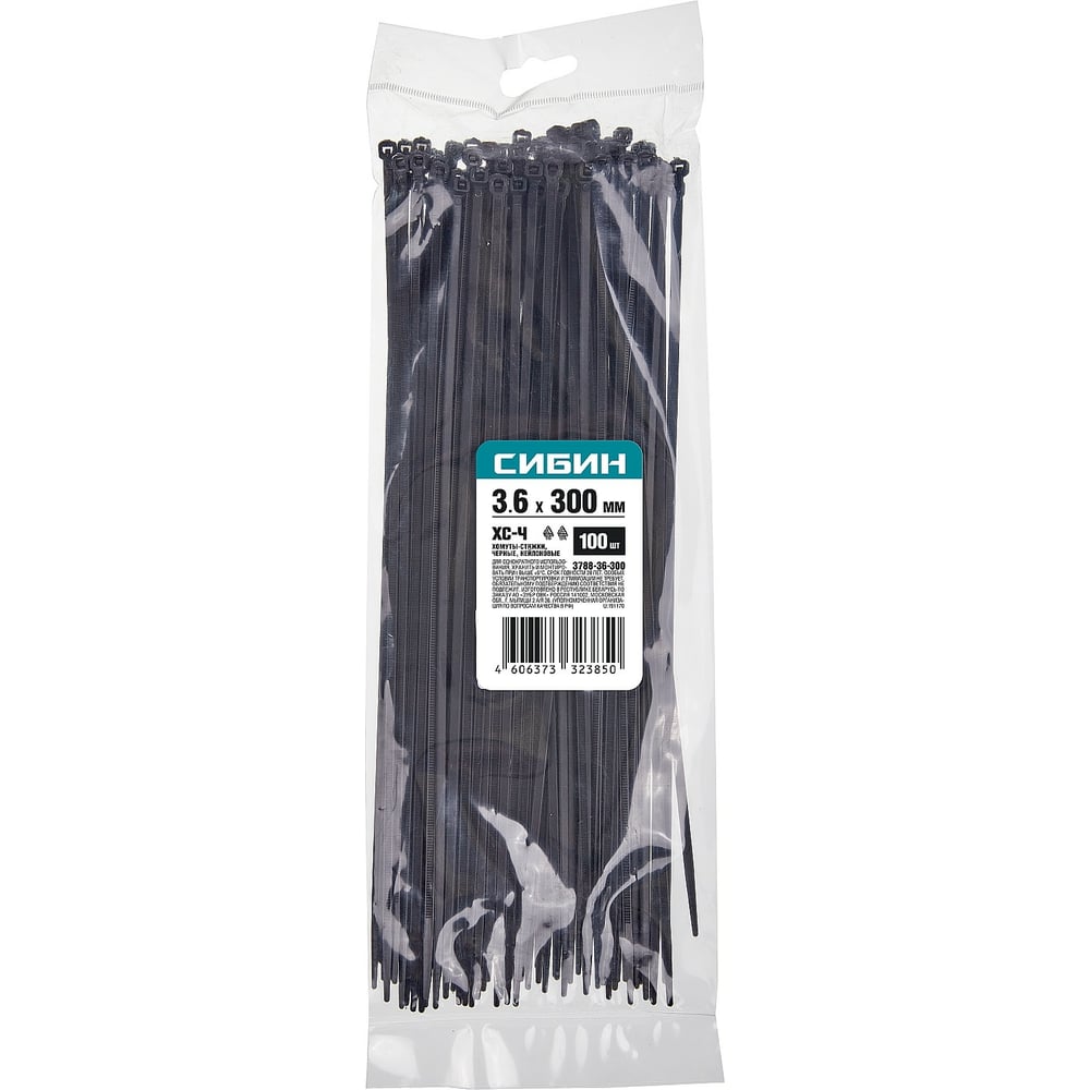 Хомуты-стяжки СИБИН ХС-Ч черные, 3.6х300 мм, 100 шт, нейлоновые, 3788-36-300