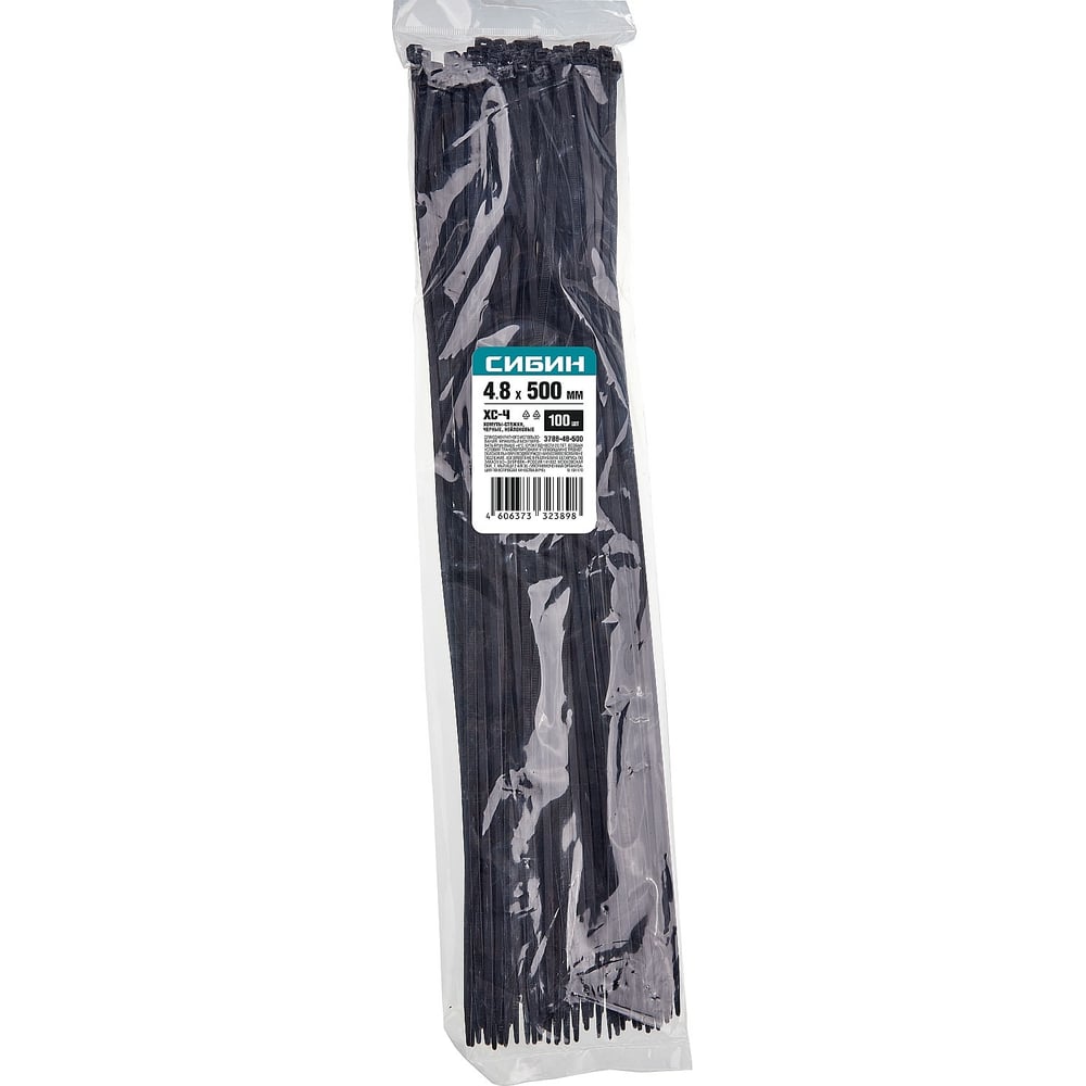 Хомуты-стяжки СИБИН ХС-Ч черные, 4.8х500 мм, 100 шт, нейлоновые, 3788-48-500