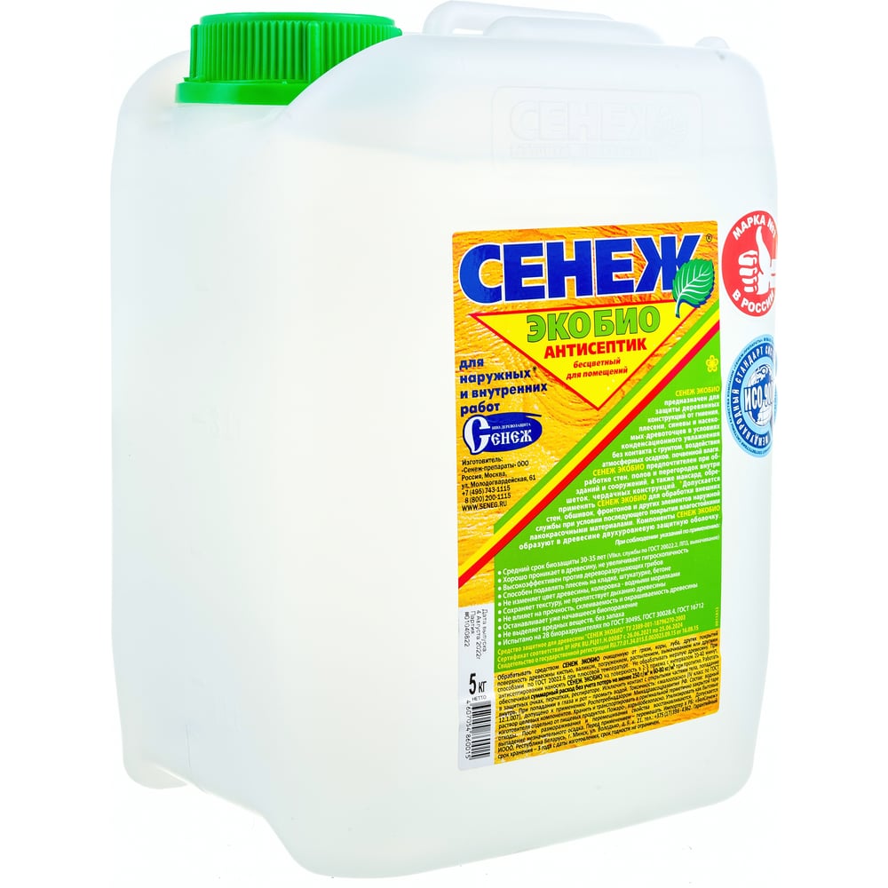 Антисептик СЕНЕЖ ЭКОБИО 5 кг эконом. бесцветный для помещений и дер. констр. под навесом 24358 00000000629