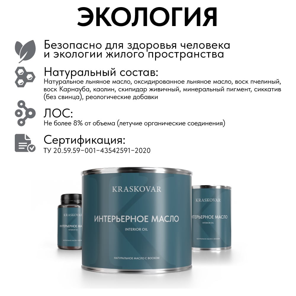 | Состав | натуральное льняное масло, оксидированное льняное масло, воск пчелиный, воск Карнауба, каолин, скипидар живичный, минеральный пигмент, сиккатив (без свинца), реологические добавки |
