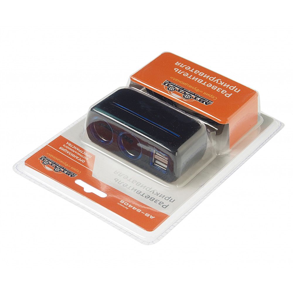 АВТОСТОП Разветвитель прикуривателя BLACK на 2 гнезда +3USB с подсветкой 12-24V AB-54406