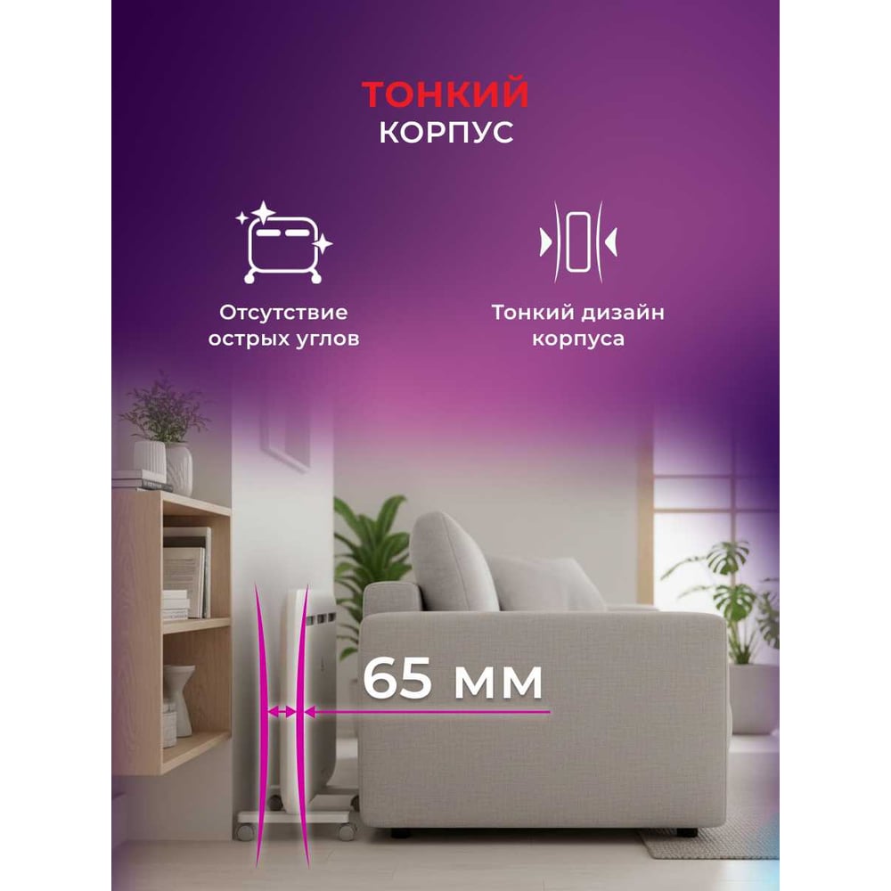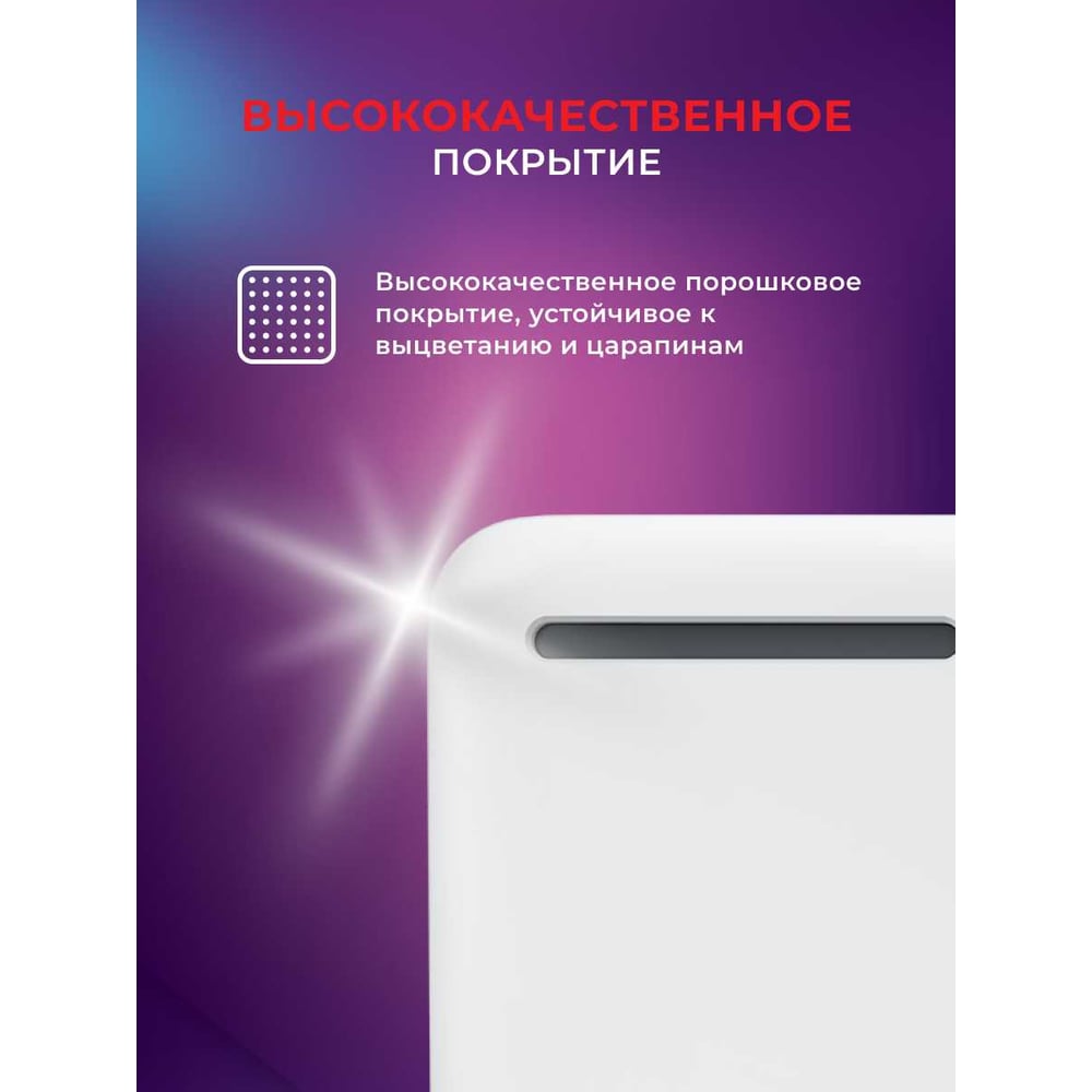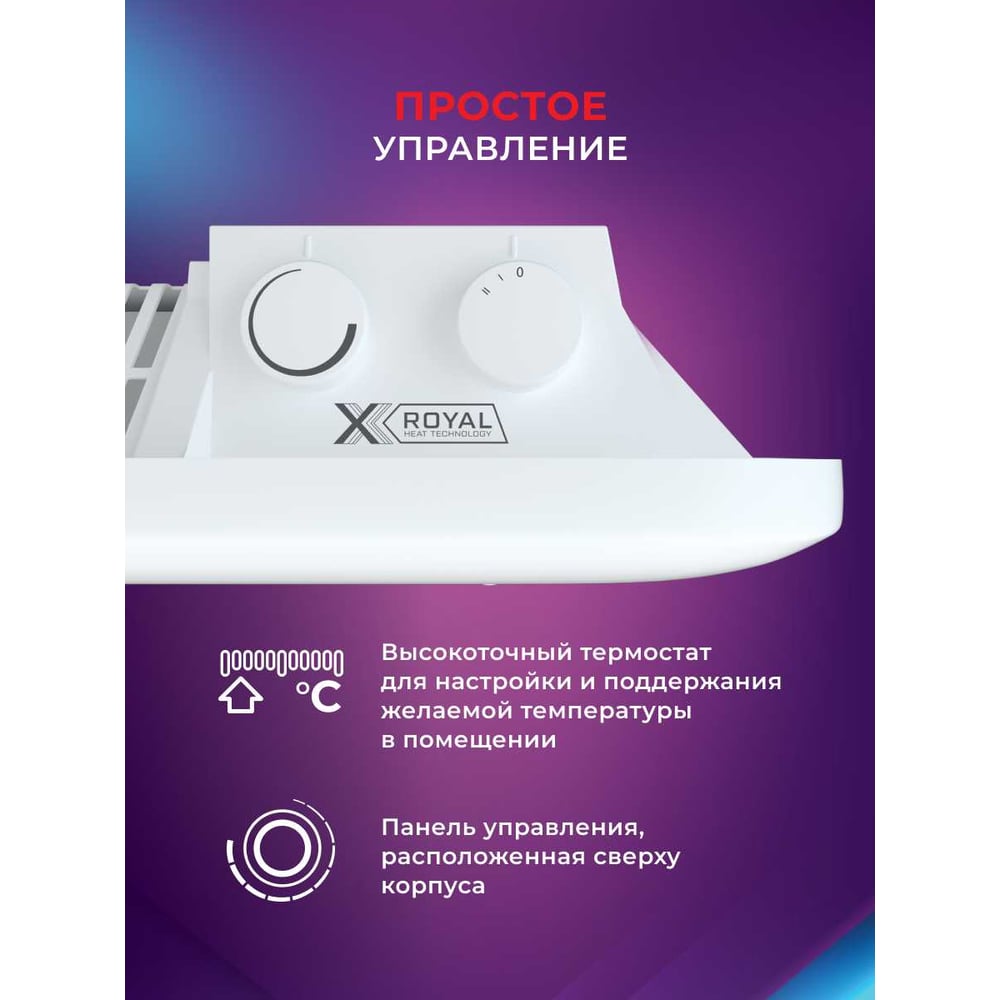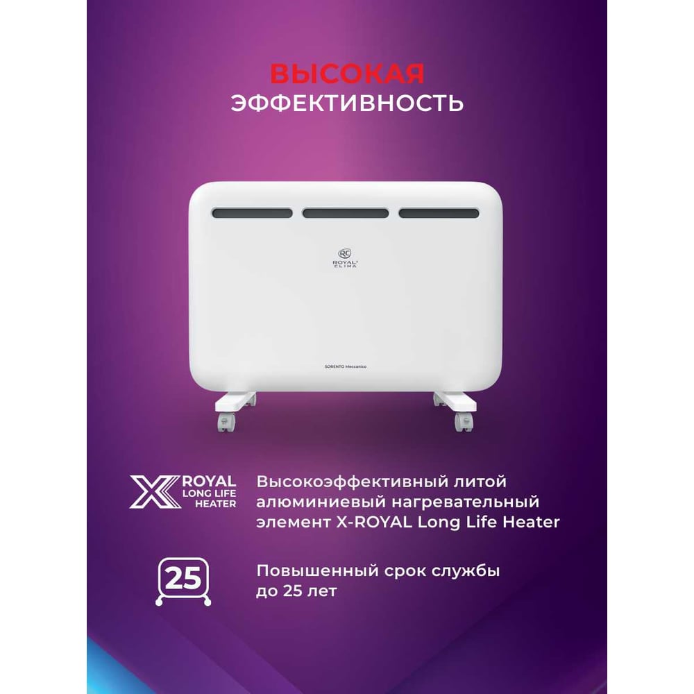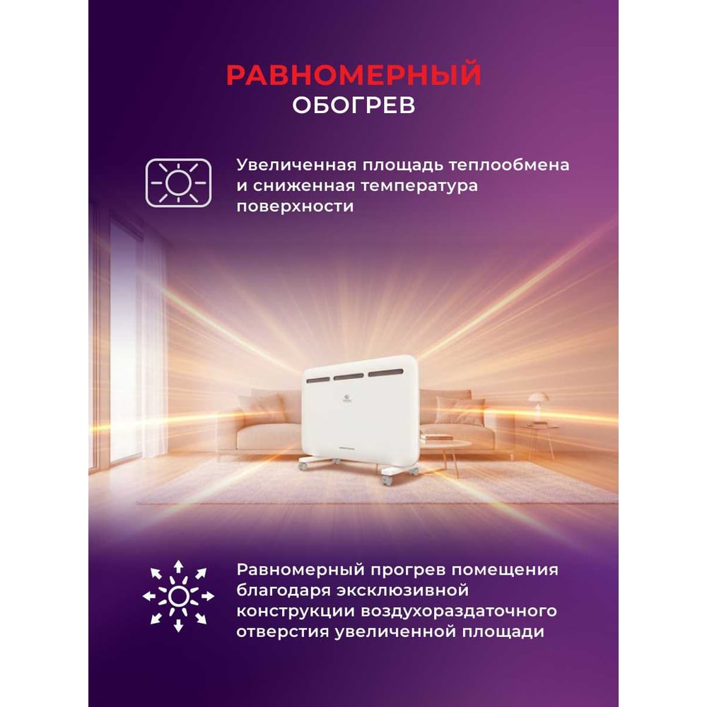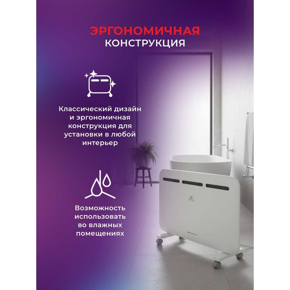 Габариты без упаковки 645x500x65 мм Высота 500 мм Ширина 645 мм Цвет белый Вес нетто 4.3 кг Материал корпуса металл Вид крепления настенный/напольный Серия SORENTO MECCANICO Степень защиты IP24 Напряжение 220 В Глубина 65 мм Световая индикация есть Заземление есть Дисплей нет Рекомендуемая площадь 20 м² Max мощность 1.5 кВт Наличие сетевой вилки есть Поддержка Wi-fi нет Защита от перегрева да Встроенный вентилятор нет Инверторная технология нет Вид термостата механический Ножки в комплекте есть Тип нагревательного элемента монолит (х-образный) Длина шнура 1.5 м Количество режимов мощности 2 шт Для системы Умный дом нет Ступени мощности 0.9/1.5 кВт Пульт ДУ в комплекте нет Антизамерзание нет