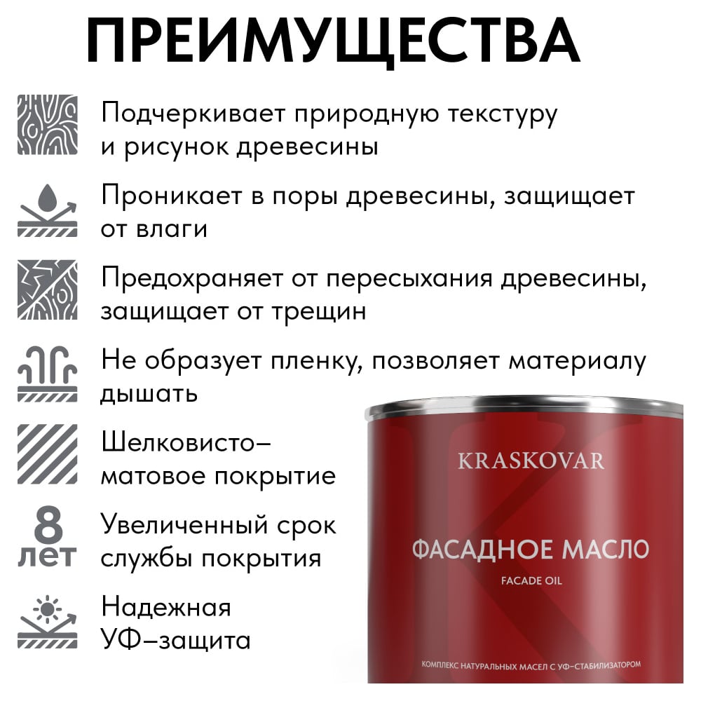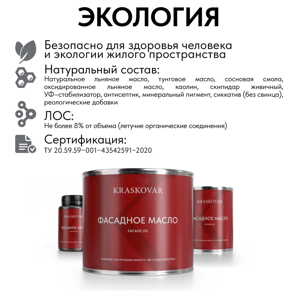 | Состав | натуральное льняное масло, тунговое масло, сосновая смола, оксидированное льняное масло, каолин, скипидар живичный, УФ–стабилизатор, антисептик, минеральный пигмент, сиккатив (без свинца), реологические добавки |