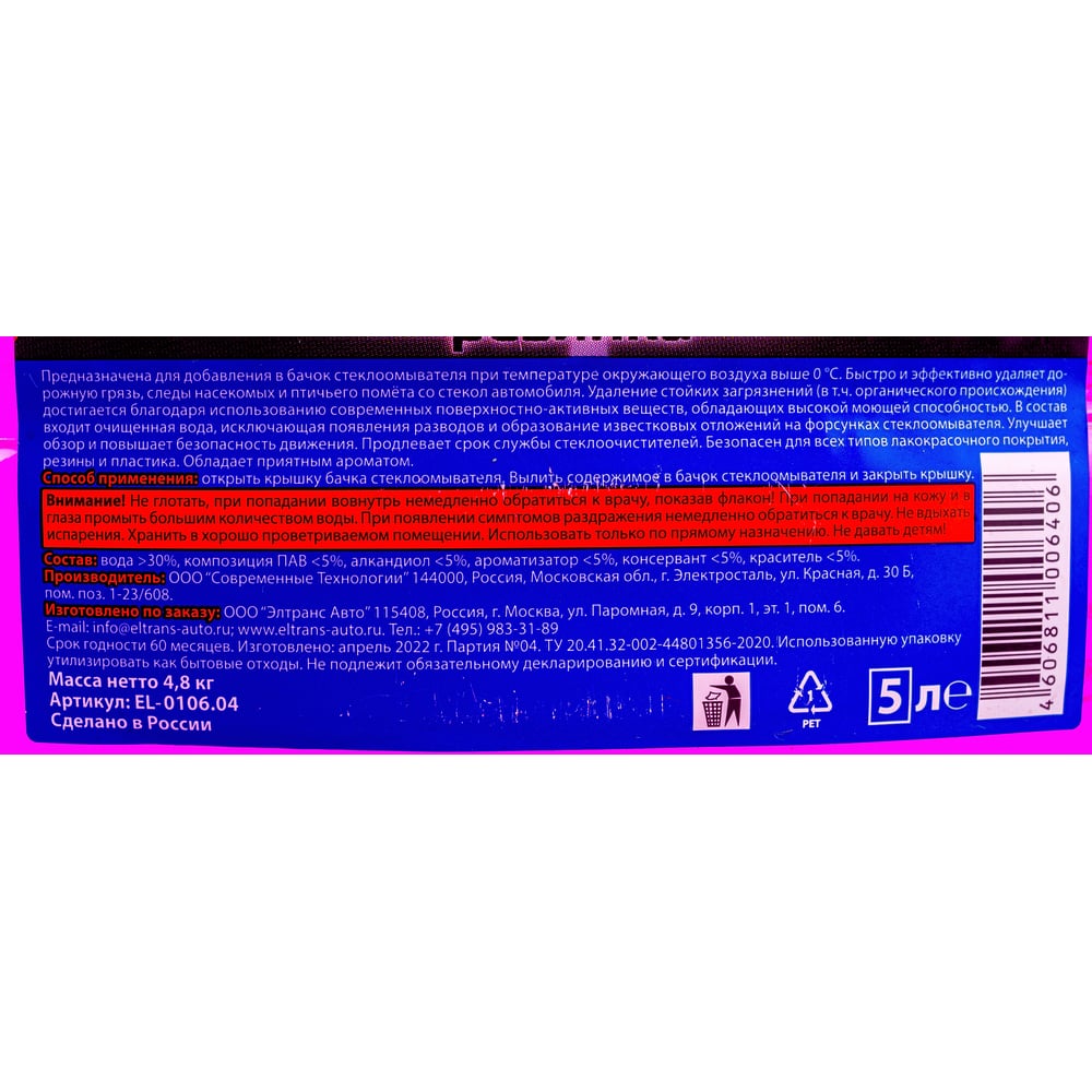 Жидкость стеклоомывателя ELTRANS ЛЕТО EL-0106.04