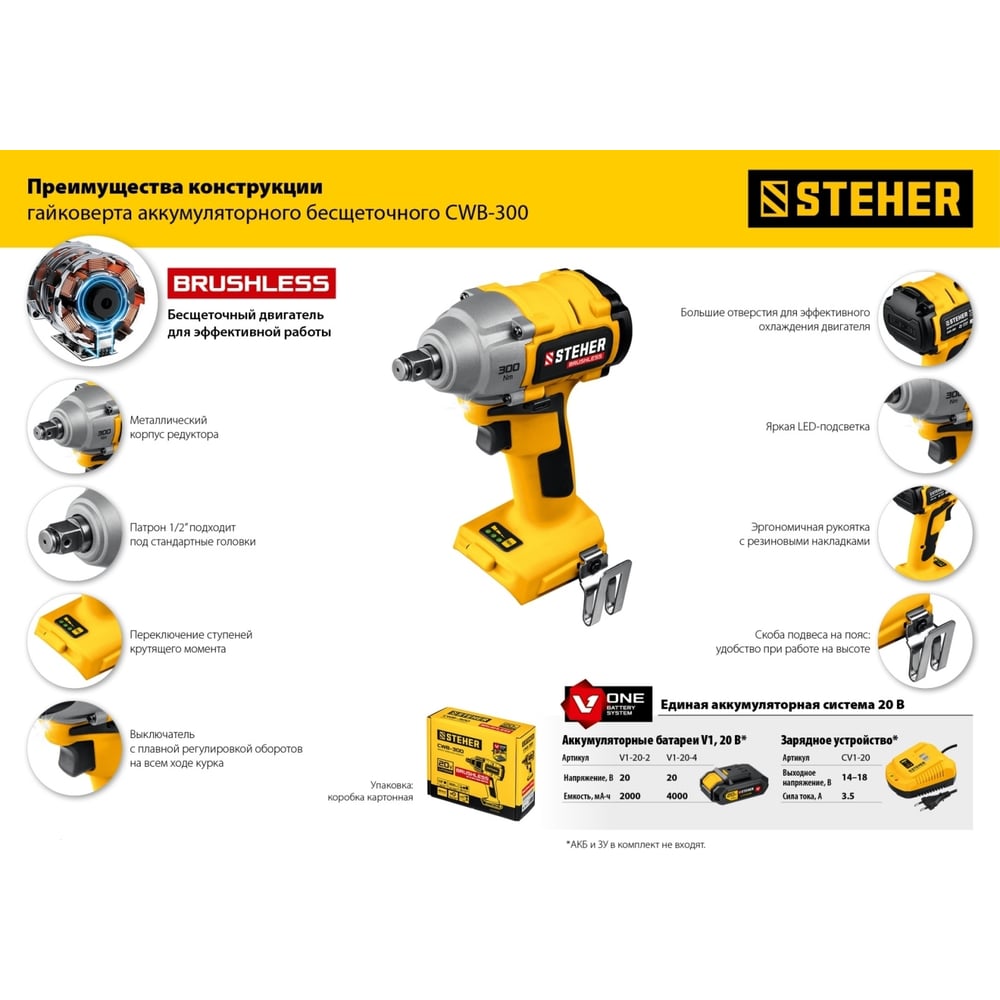Бесщеточный гайковерт STEHER 20В, без АКБ CWB-300