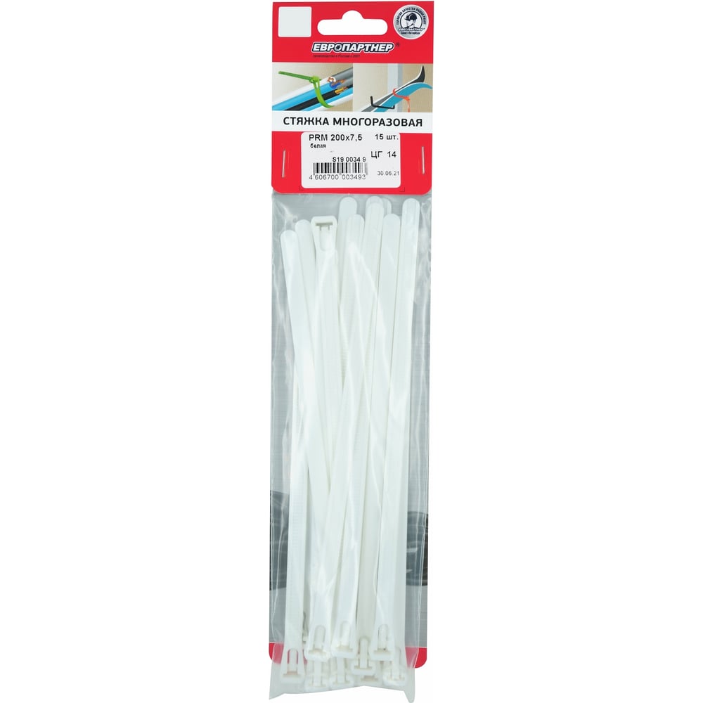 Многоразовая стяжка ЕВРОПАРТНЕР PRM 7,5х200 белый 15 шт. S19 0034 9