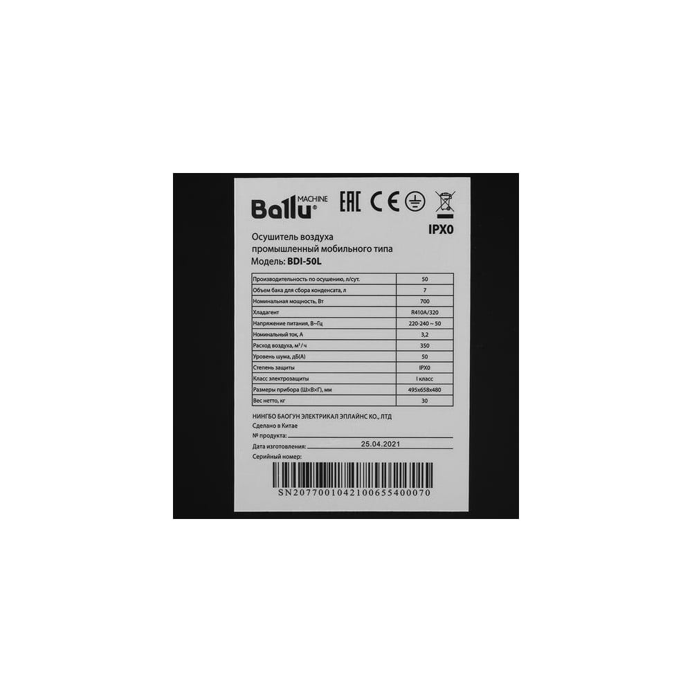 Промышленный осушитель воздуха мобильного типа Ballu BDI-50L НС-1299844