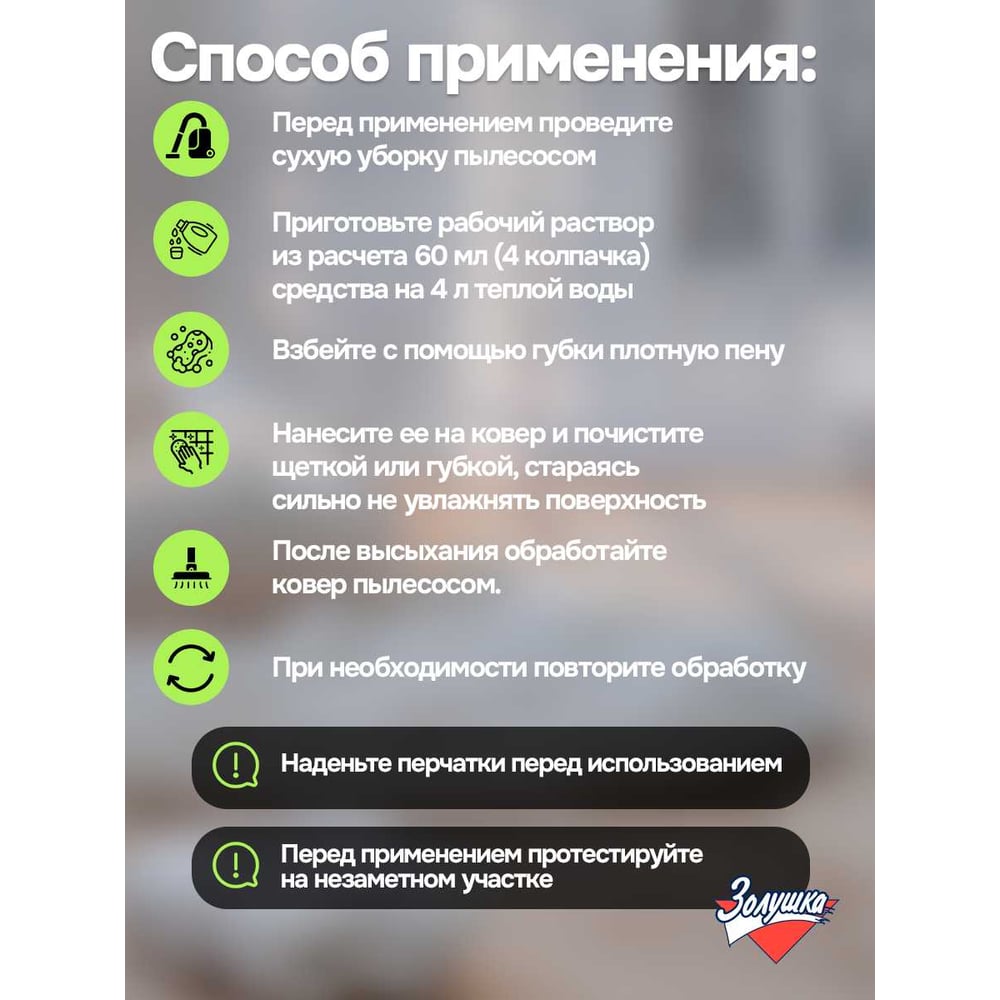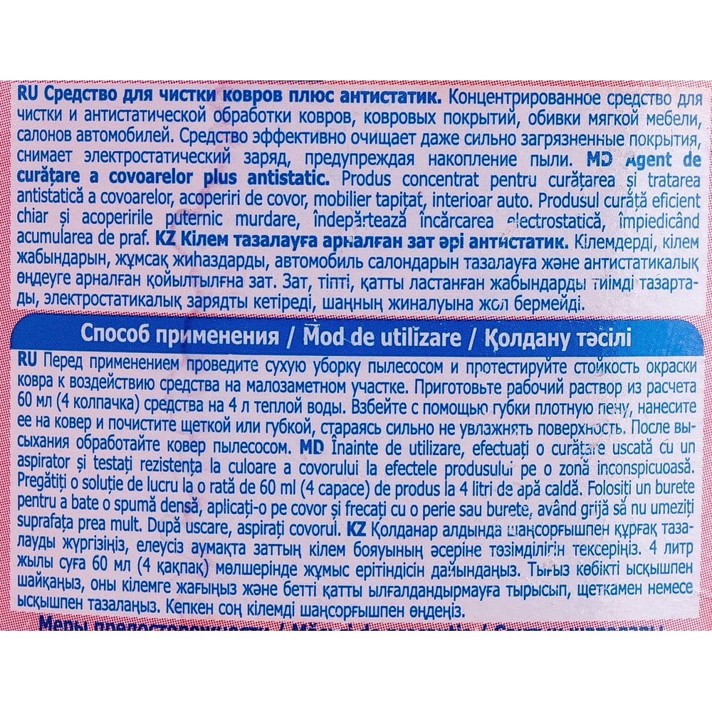 | Расход | 60 мл (4 колпачка) средства на 4 л теплой воды |