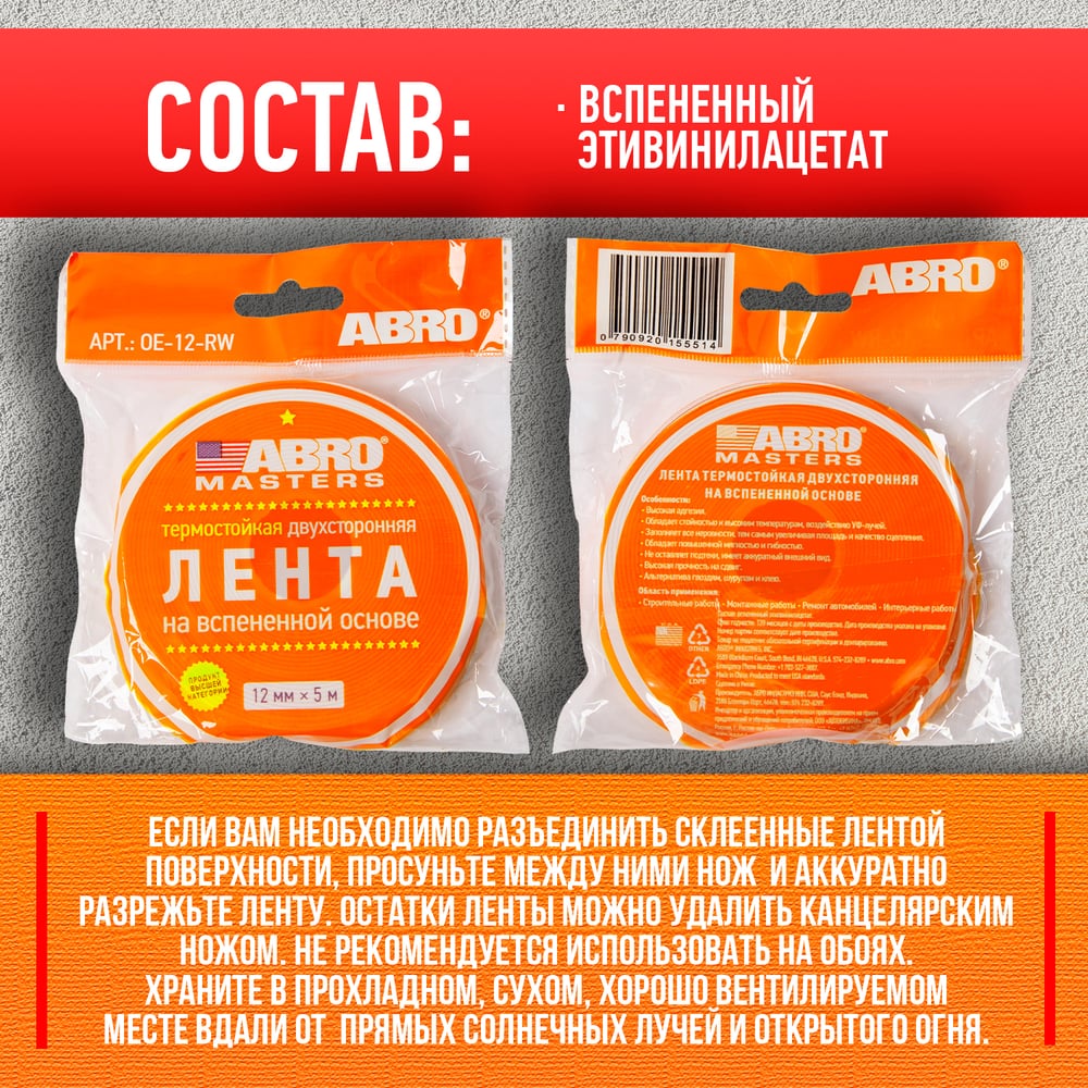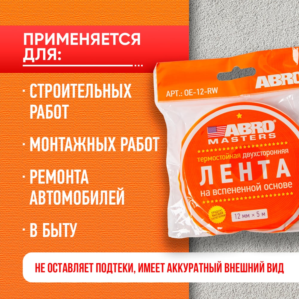 Двухсторонняя клейкая лента ABRO MASTERS OE-12-RW