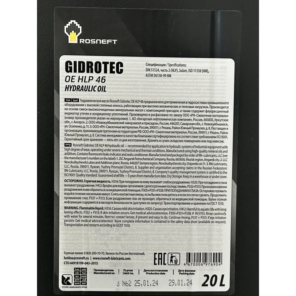 Гидравлическое масло Gidrotec OE HLP 46 минер. кан. 20 л РОСНЕФТЬ 9166