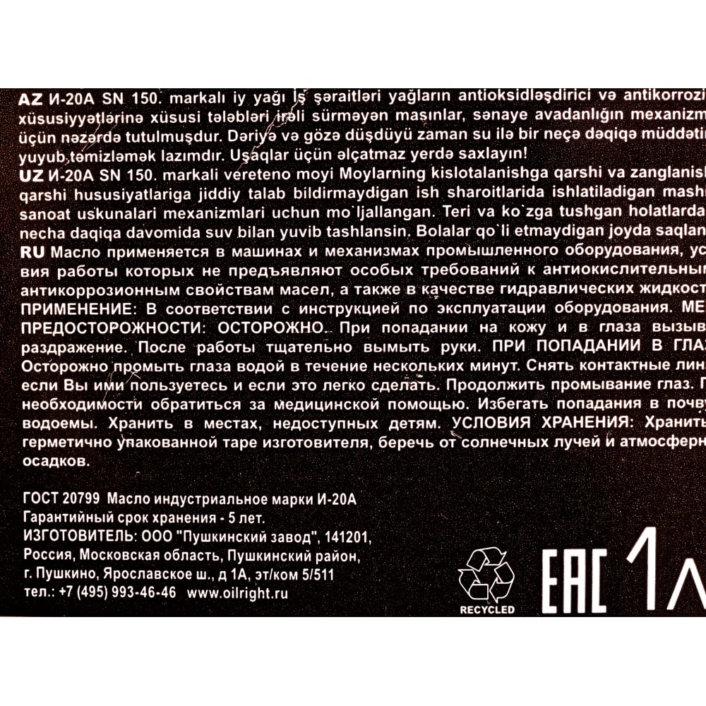 Масло веретенное И-20 А 1 л OILRIGHT 2590