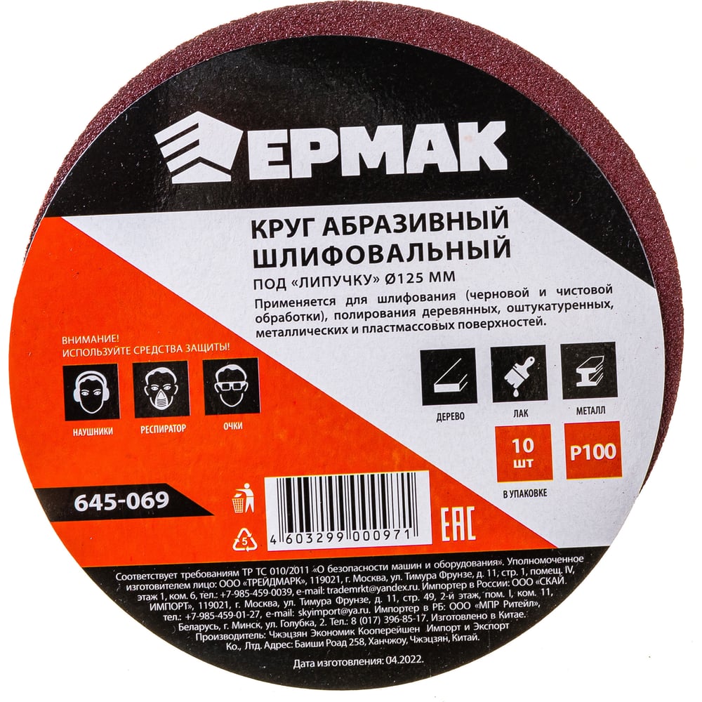Круг абразивный шлифовальный под липучку (10 шт; 125 мм; Р100) ЕРМАК 645-069
