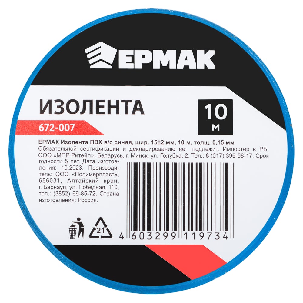 Изолента ЕРМАК ПВХ в/с, синяя, шир. 15+-2 мм, 7,5 м, толщ. 0,2 мм 672-007