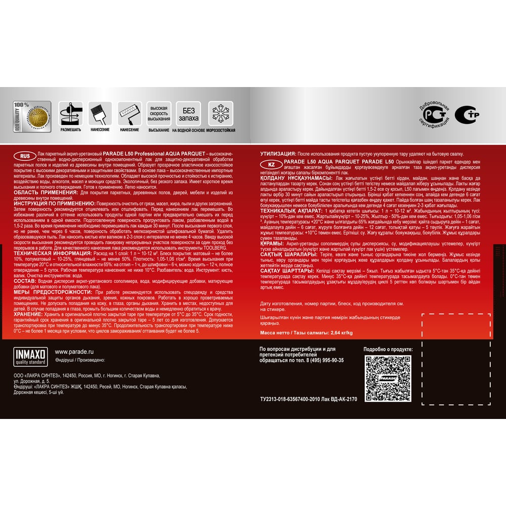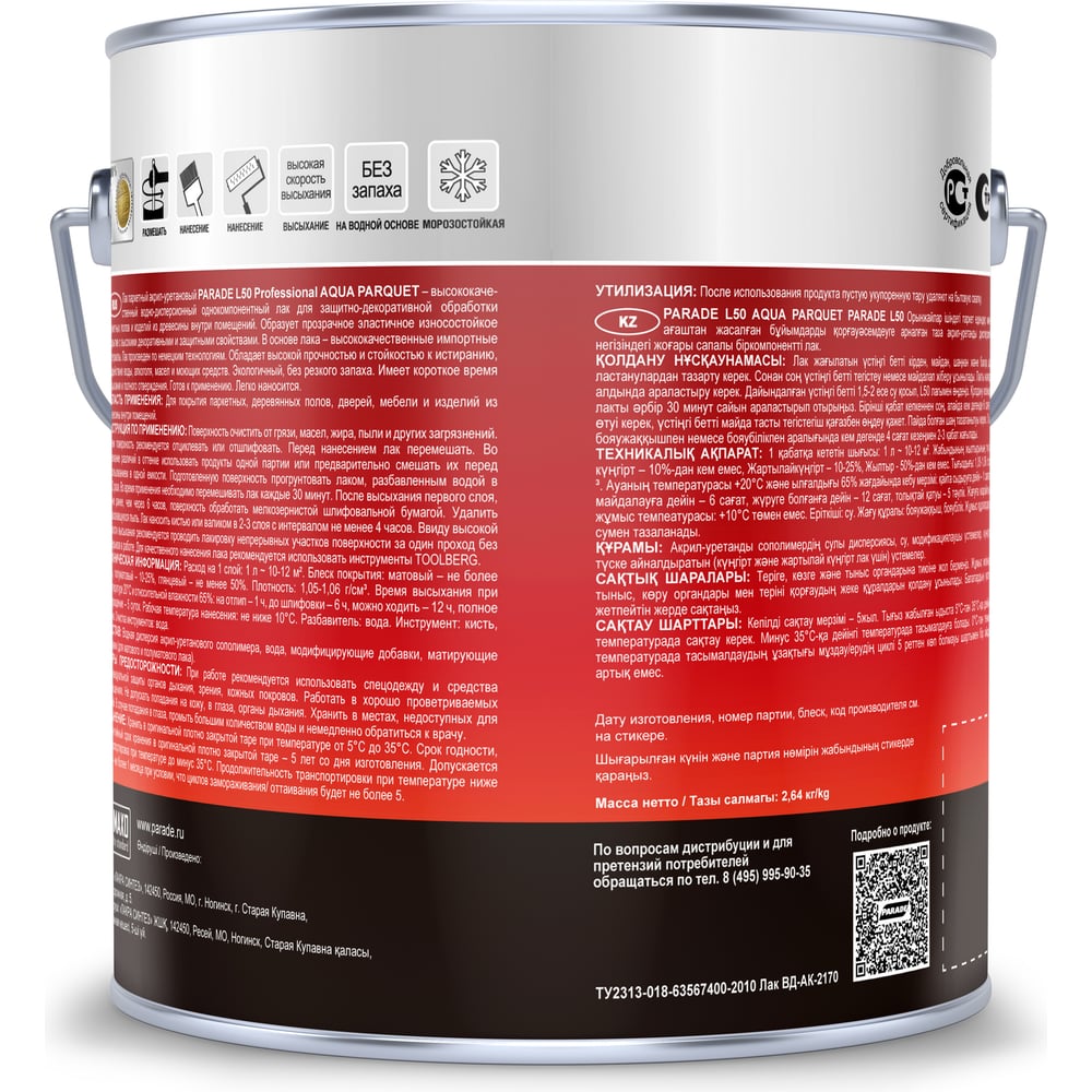 Лак PARADE Professional акрил-уретановый паркетный L50 AQUA PARQUET П/мат 2,5 л Россия 90001370042