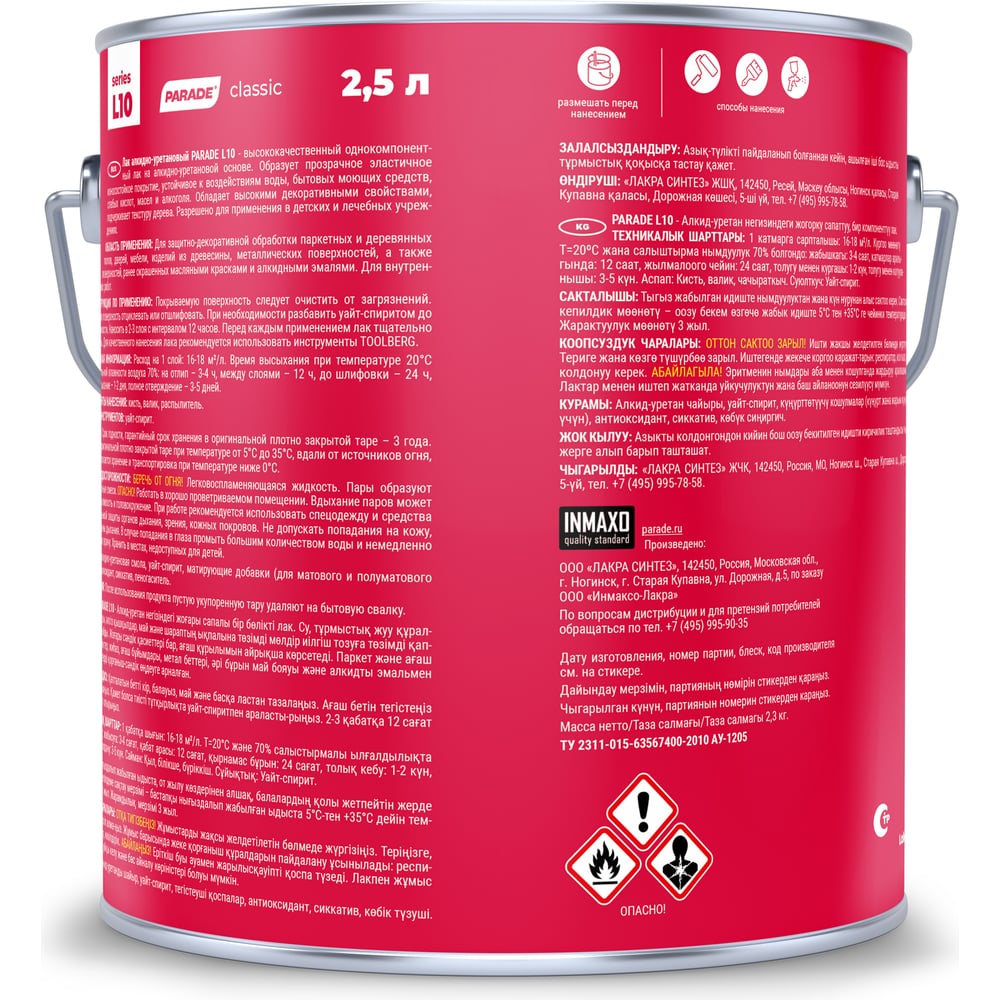 Лак паркетный алкидно-уретановый PARADE L10 Паркет & Деревянный пол п/мат 2,5 л 90001484462