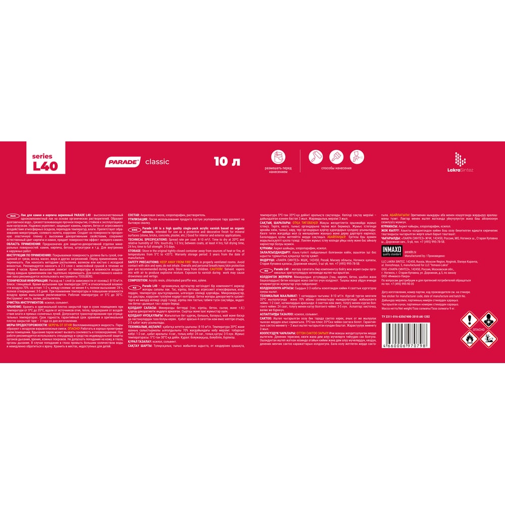 Лак для камня акриловый глянцевый на растворителе PARADE L40 Камень & Кирпич 10 л Россия 90003467456