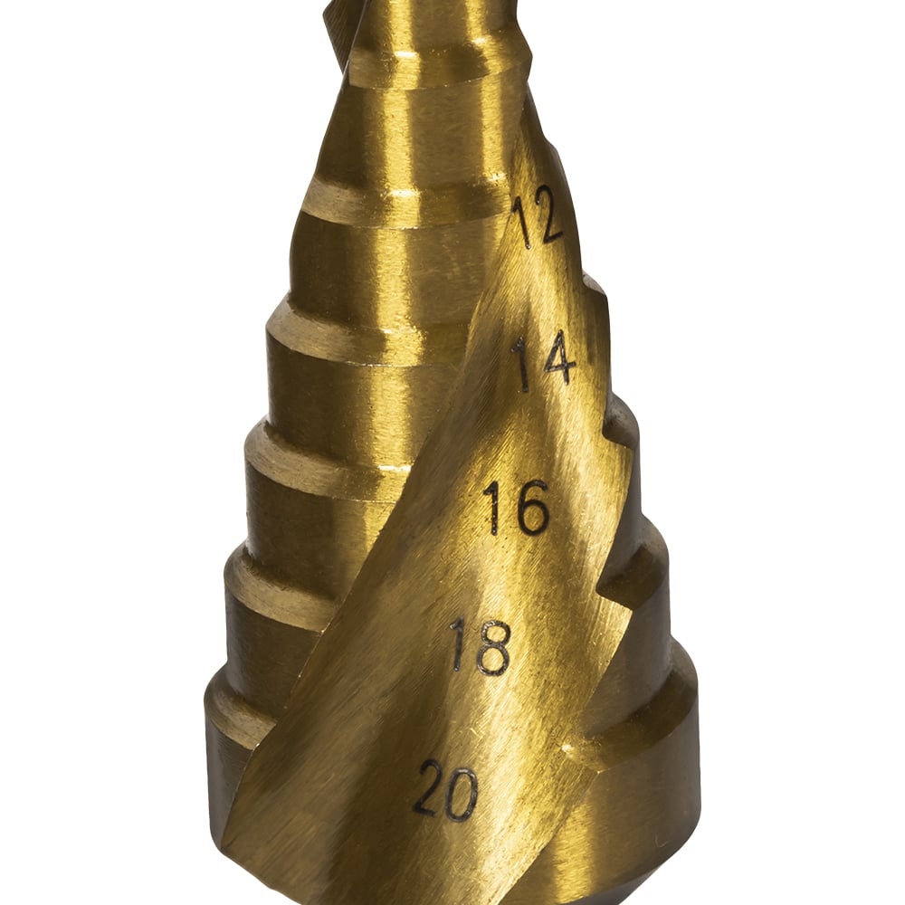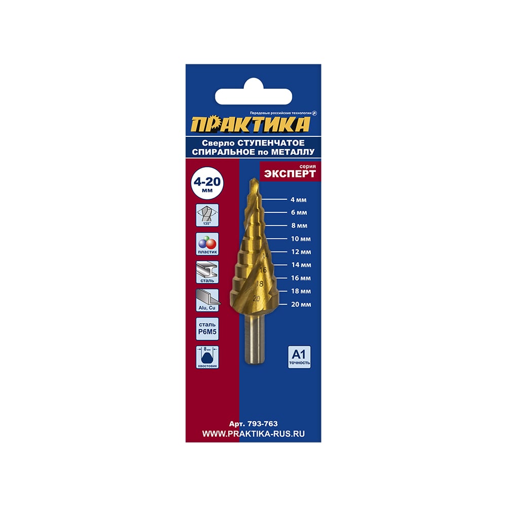 Сверло ступенчатое спиральное с кобальтовым покрытием по металлу (4-20 мм; шаг 2 мм; 3-х гран.хвост.8 мм) ПРАКТИКА 793-763
