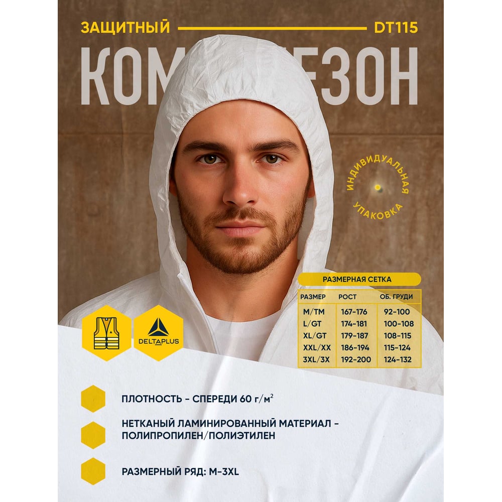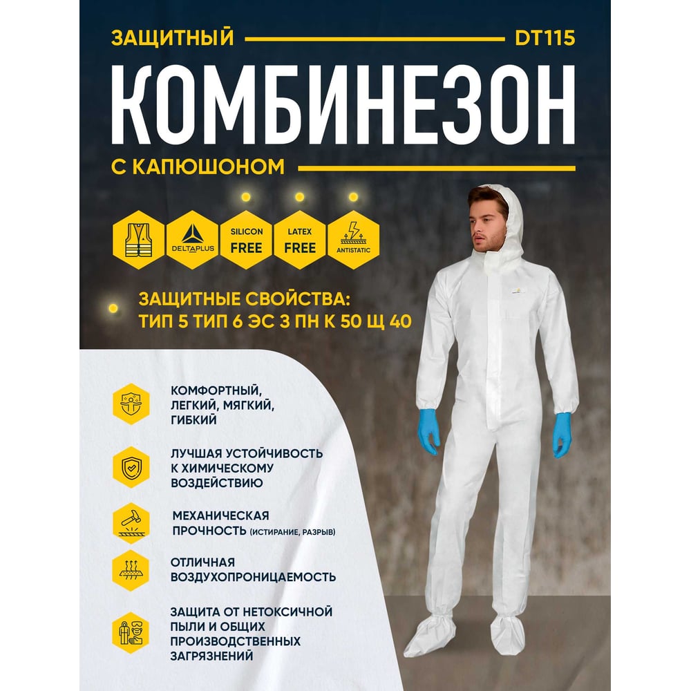 | Защитные свойства | от твердых частиц - 5; от брызг кислот, щелочных веществ и воды - 6. Антистатические свойства. |