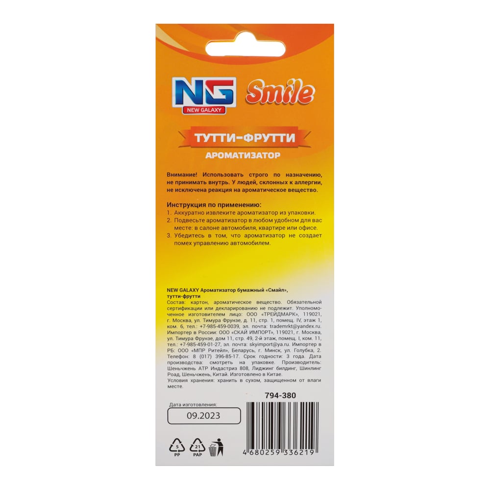 Ароматизатор бумажный NEW GALAXY Смайл, тутти фрутти, Дизайн GC 794-380