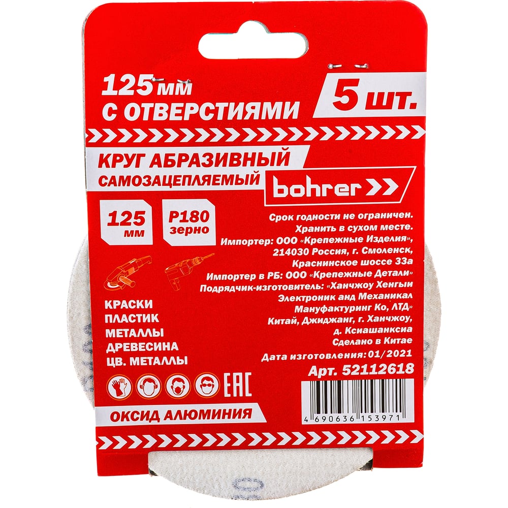 Круг абразивный под липучку (5 шт; 125 мм; Р180; 8 отверстий) BOHRER 52112618