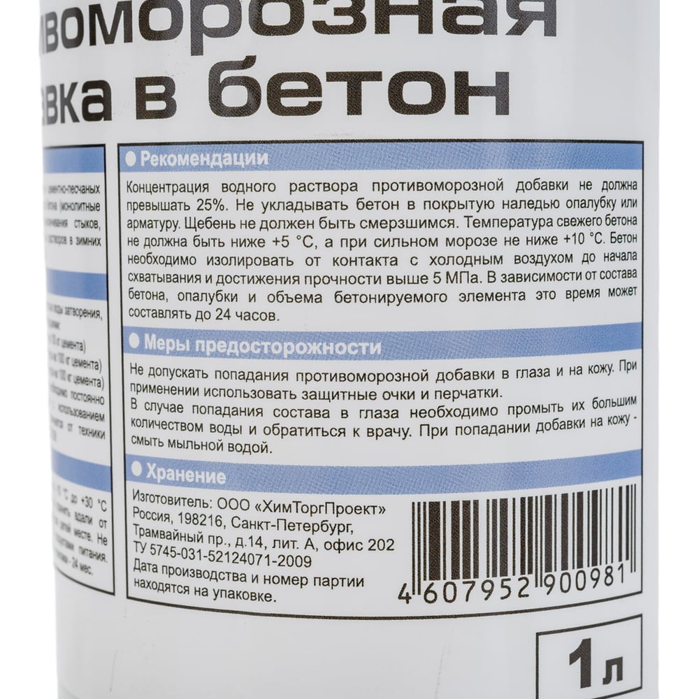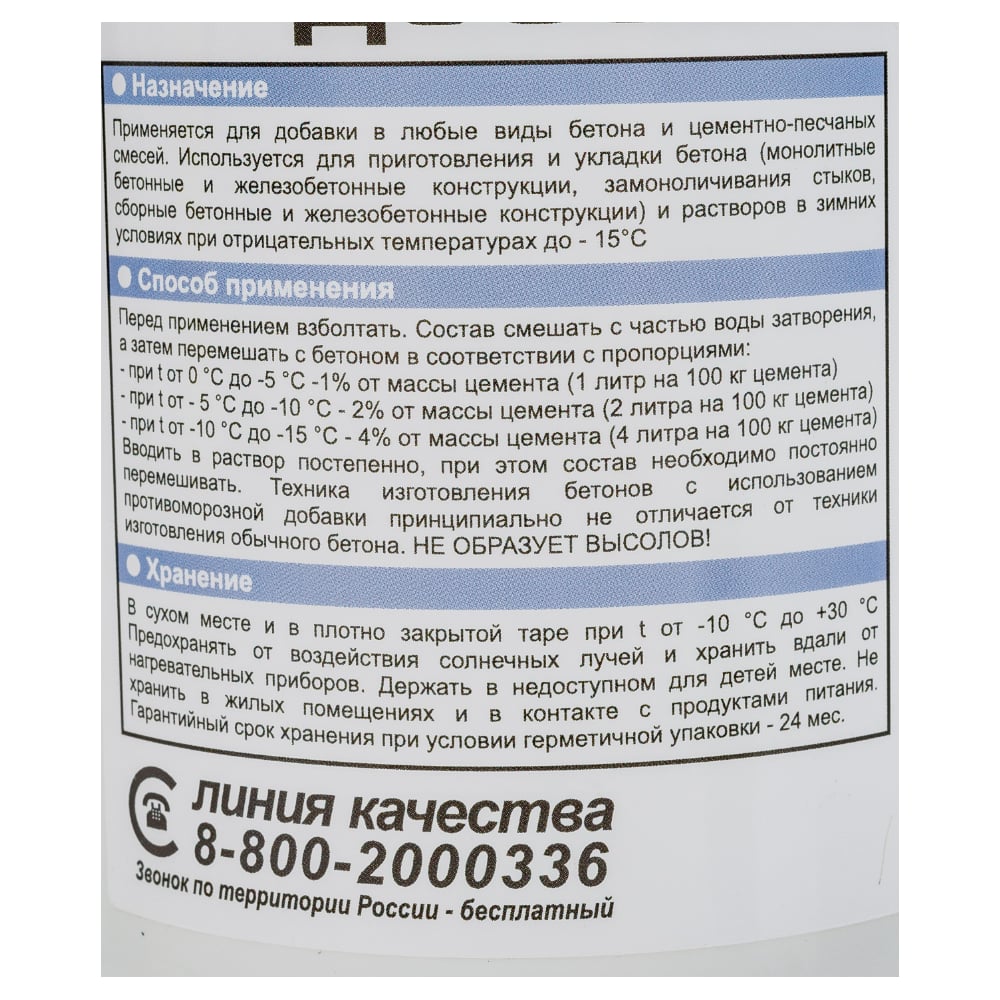 | Расход | при температуре от 0С до -5С 1 л на 100 кг цемента; при температуре от -10С до -15С 4 л на 100 кг цемента; при температуре от -5С до -10С 2 л на 100 кг цемента |