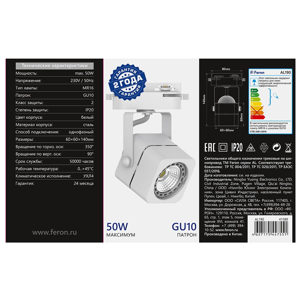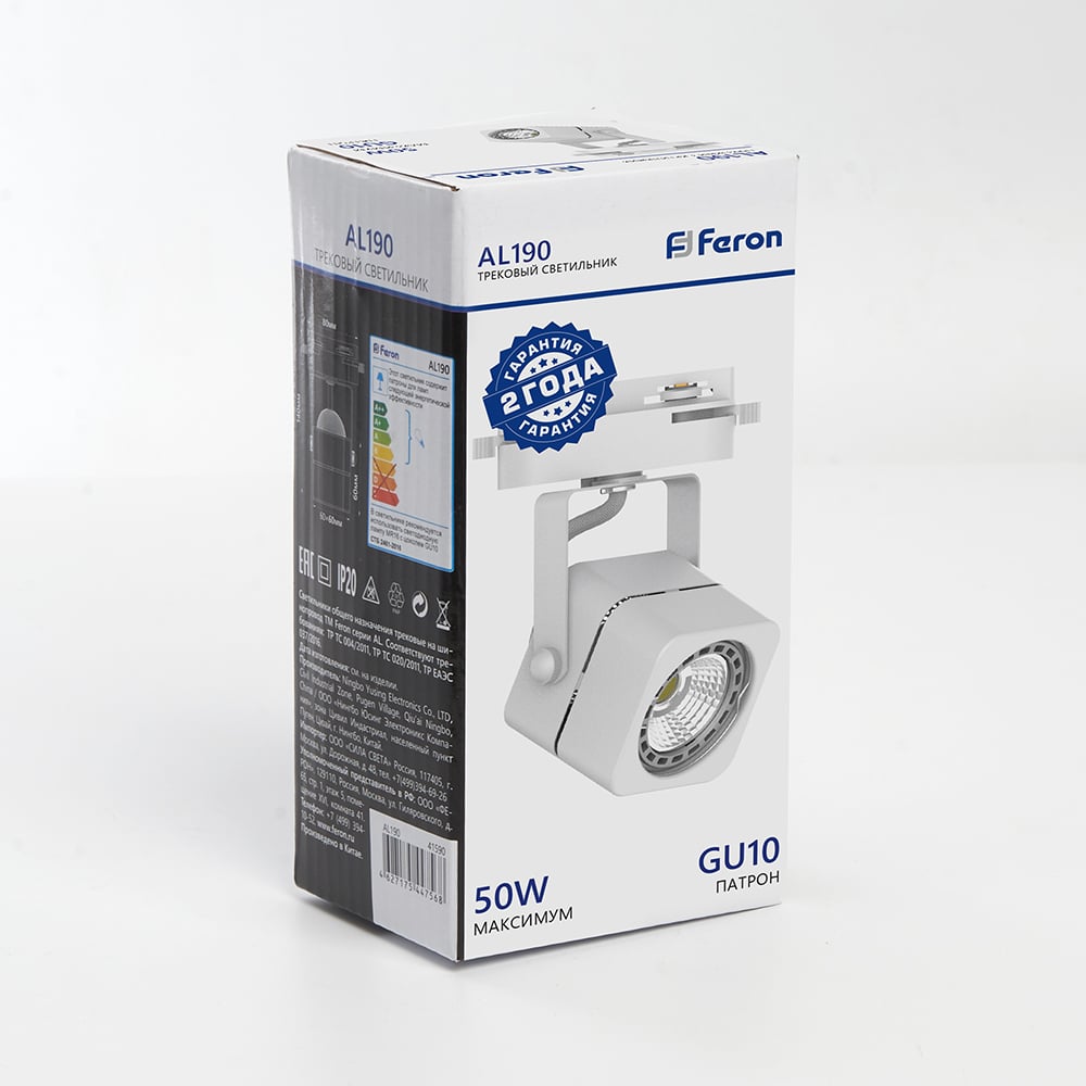 Трековый однофазный светильник на шинопровод FERON GU10, AL190, 50W, 230V, белый 41589