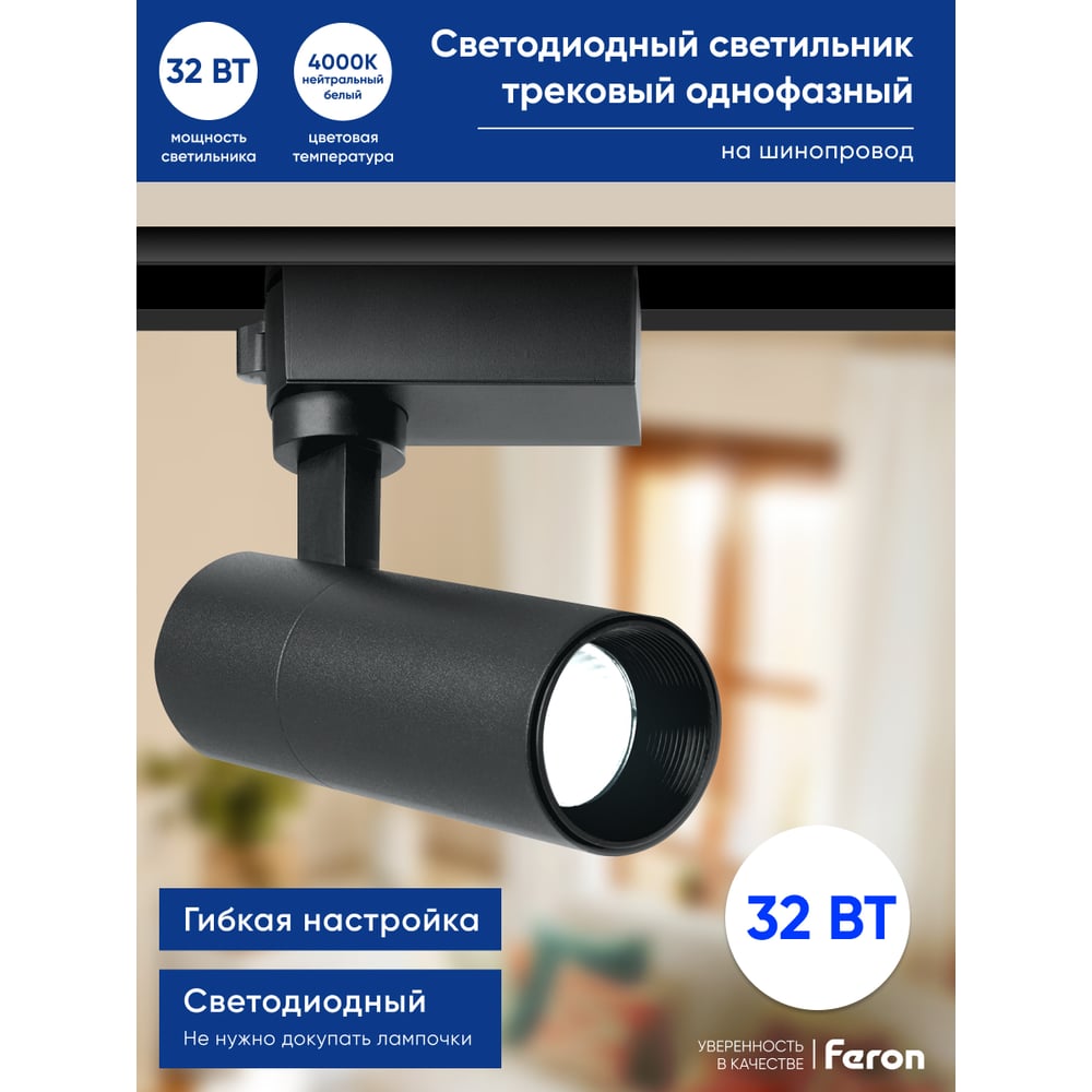 Трековый однофазный светильник FERON на шинопровод, AL140, 32W, 4000К белый, 2880Lm, черный, 41614