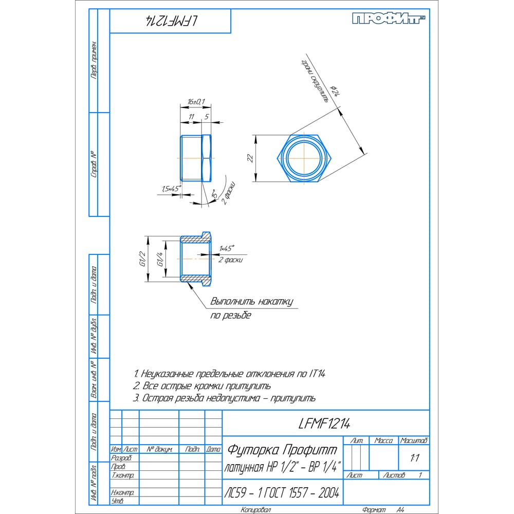 Футорка Профитт латунная, НР 1/2" х ВР 1/4" 3170420