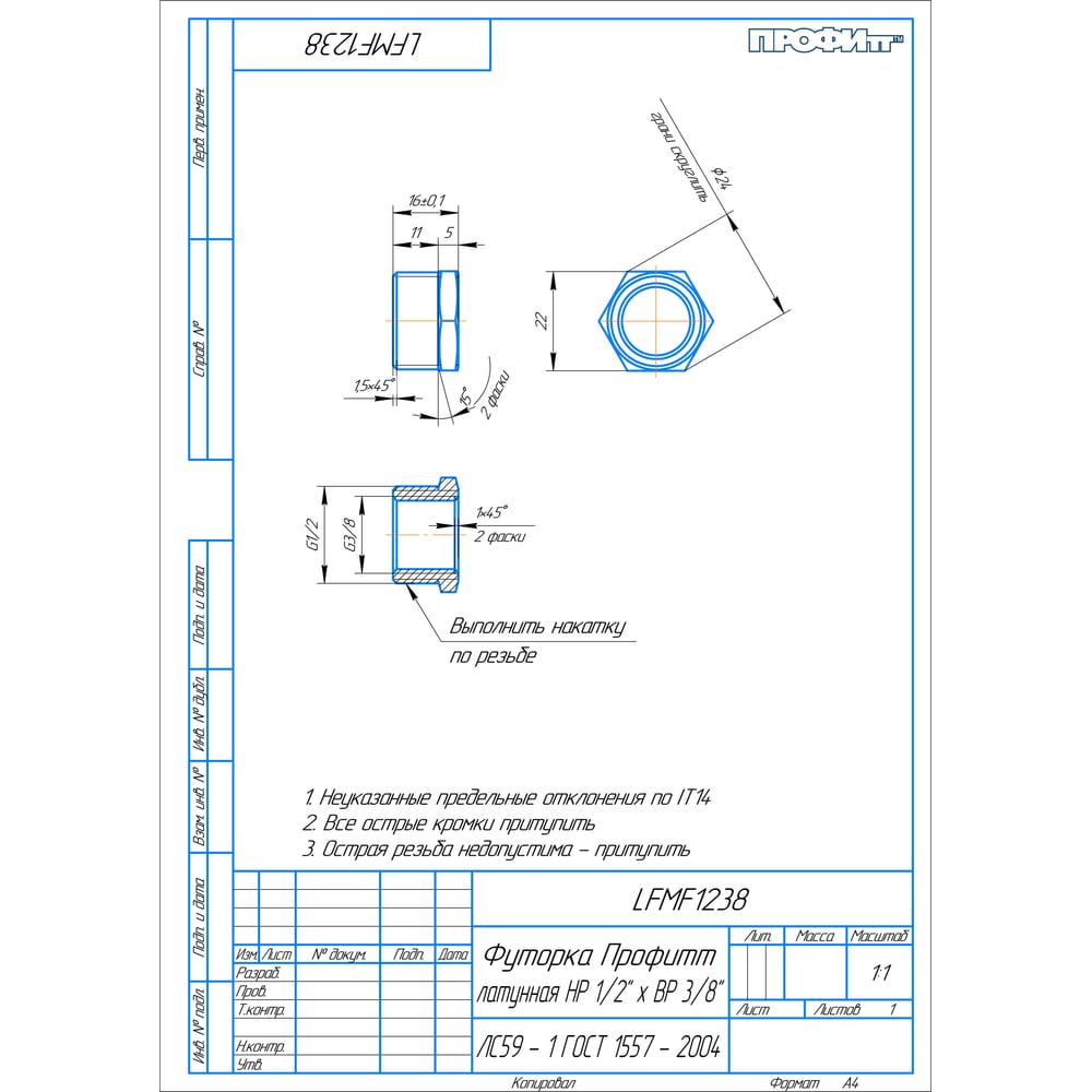 Футорка Профитт латунная, НР 1/2" х ВР 3/8" - 20 шт. 9274917