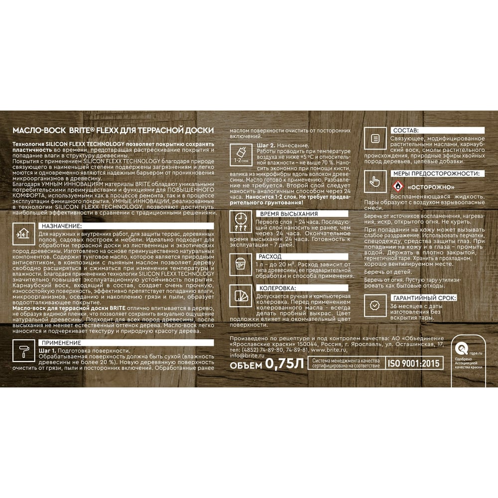 | Состав | смесь модифицированных натуральных масел, воски, древесные смолы, природные эфиры хвойных пород деревьев, целевые добавки |