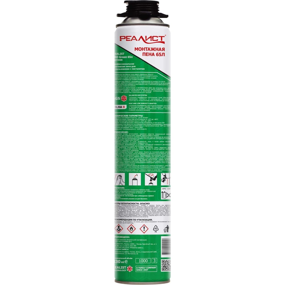 Пена монтажная REALIST PRO Green 65 л 4602009041020