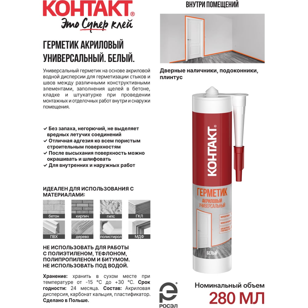 | Назначение | для герметизации стыков и швов между различными конструктивными элементами, заполнения щелей в бетоне, кладке и штукатурке при проведении монтажных и отделочных работ внутри и снаружи помещения |
