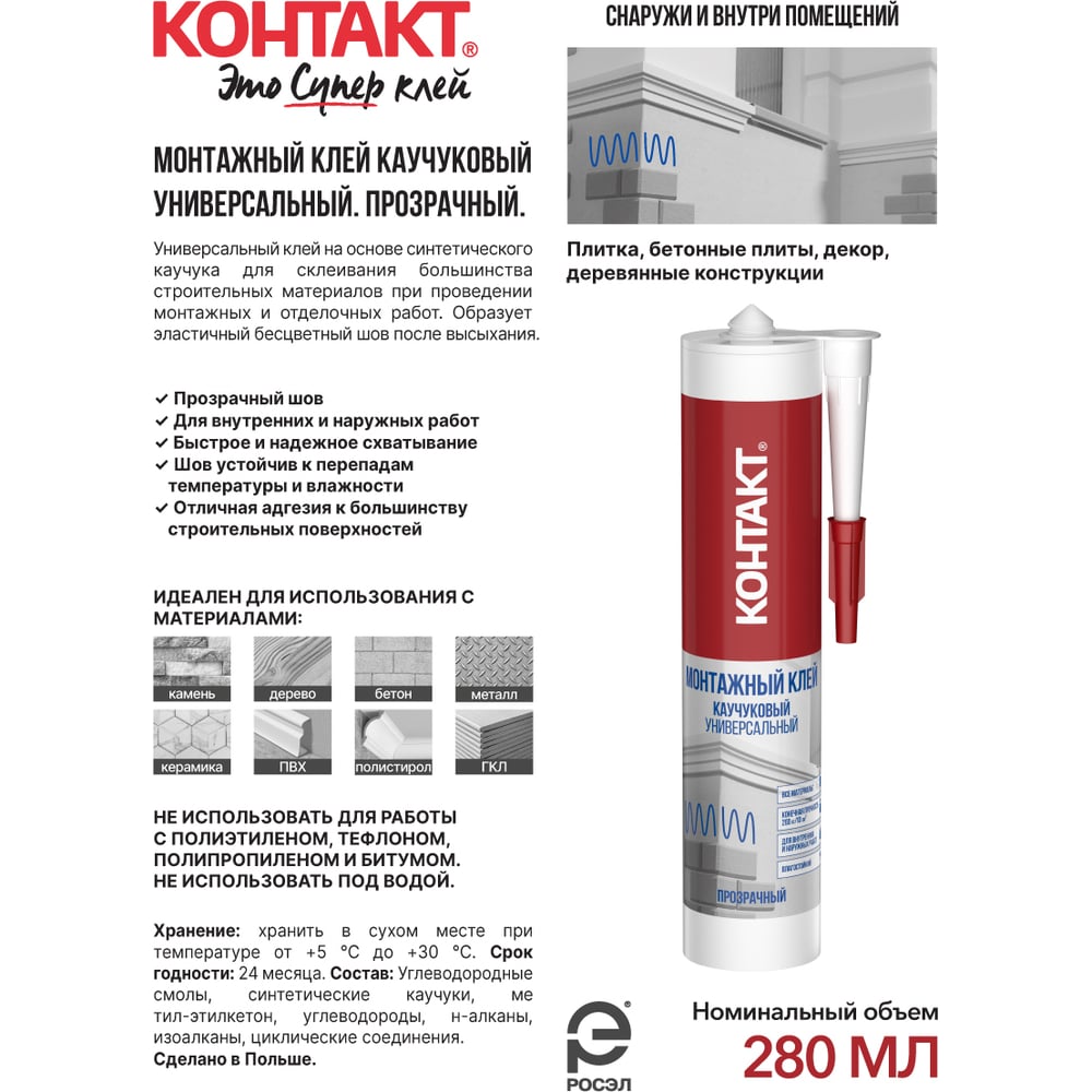 | Склеиваемые материалы | камень, дерево, бетон, металл, керамика, ПВХ, полистирол, ГКЛ |