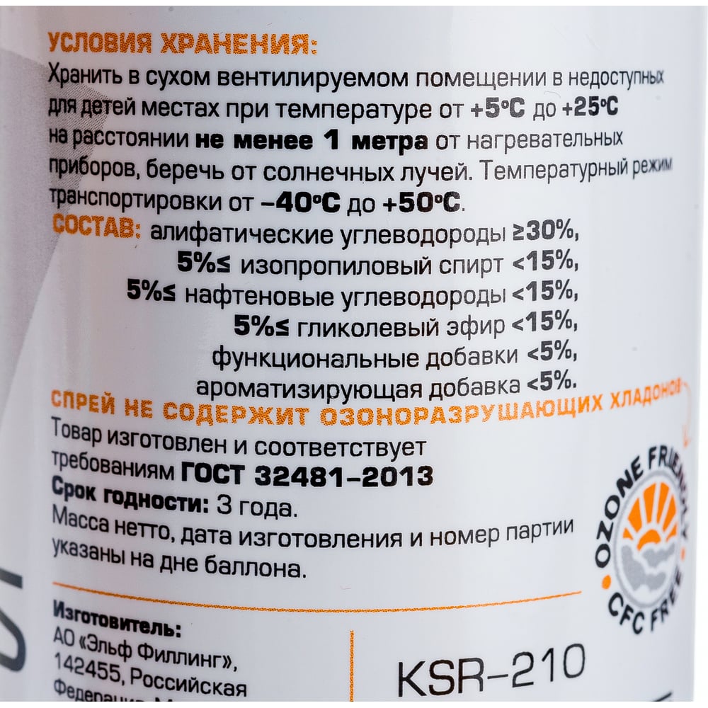 | Состав | Алифатические углеводороды >=30% 5%=< изопропиловый спирт <=15% 5%=< нафтеновые углеводороды <=15% 5%=< гликолевый эфир <=15% функциональные добавки <5% ароматизирующая добавка <5% |