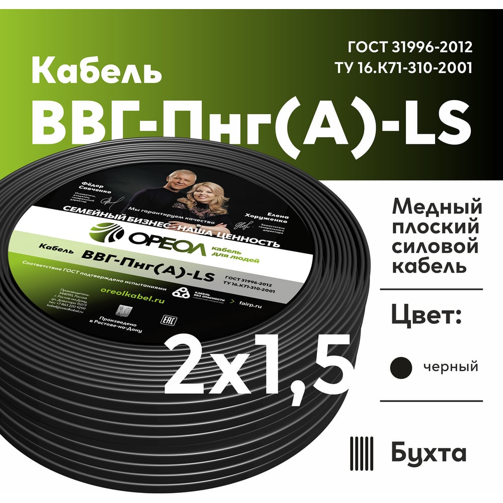Кабель ОРЕОЛ ВВГп-НГ А LS 2х1,5 мм ГОСТ 100 м 00000053387