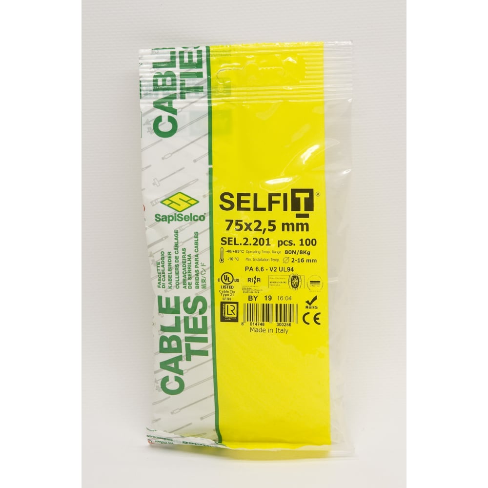 Стяжки натурального цвета SapiSelco 2.5х75 мм, полиамид 6.6, уп. 100 шт. SEL.2.201R