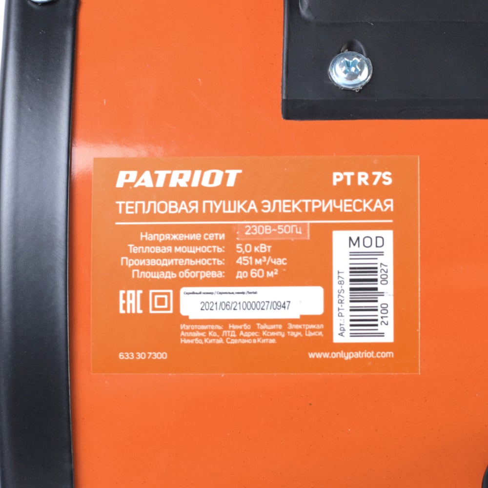 Электрический тепловентилятор Patriot PTR 7S, 5.0 кВт, 220В, терморегулятор, 633307300