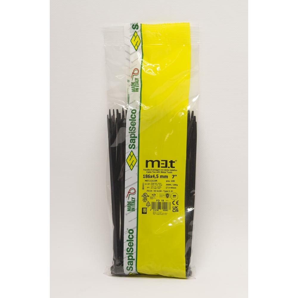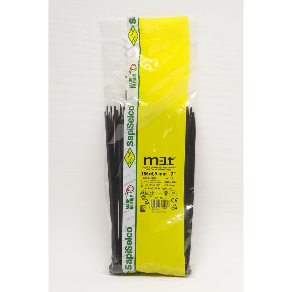 Стяжки с металлической вставкой в головке SapiSelco ME.T, черного цвета, 4.5x186, полиамид 6.6, уп.100 шт. MET.3.2123R