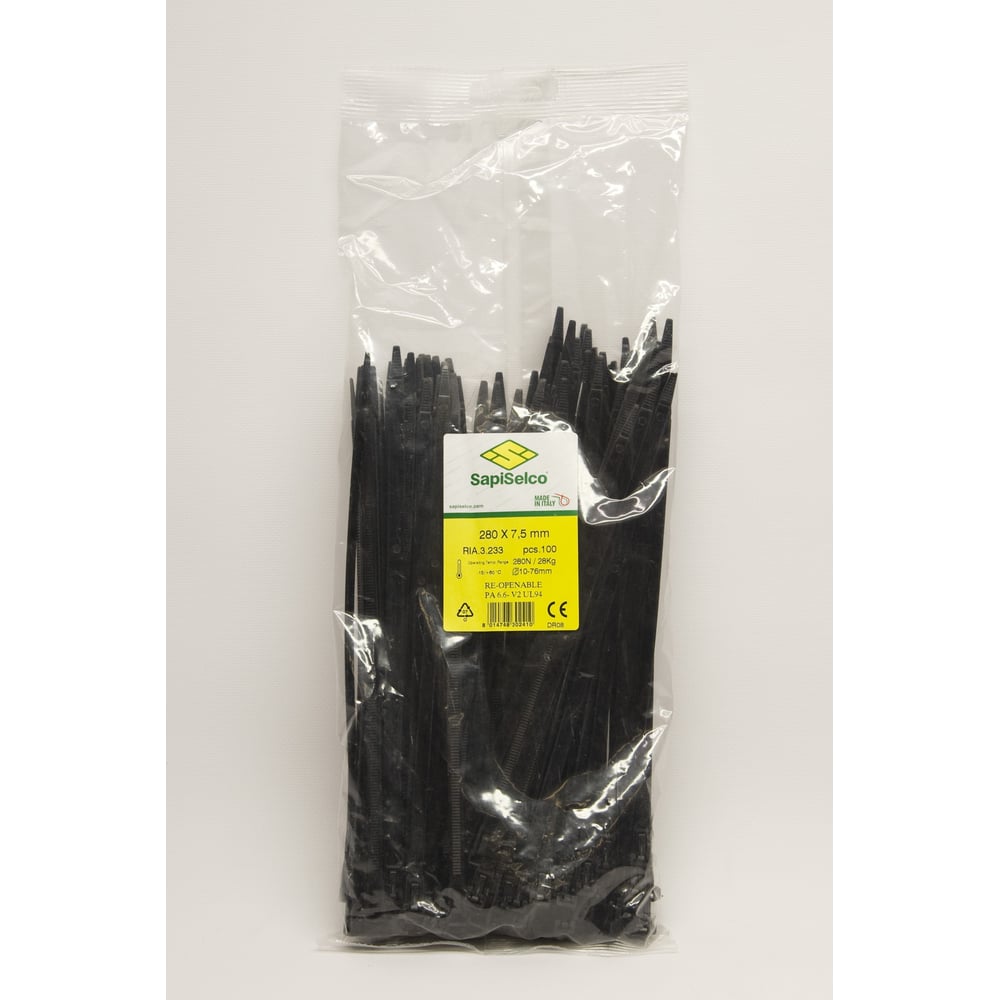 Многоразовые стяжки SapiSelco черного цвета, 7.5x280 мм, полиамид 6.6, уп. 100 шт. RIA.3.233