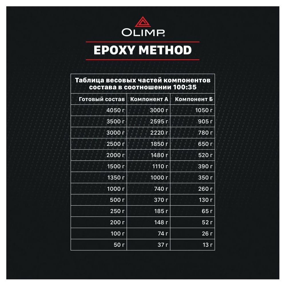 | Соотношение смолы к отвердителю | 100 частей смолы (А) к 35 частям отвердителя (Б) |
