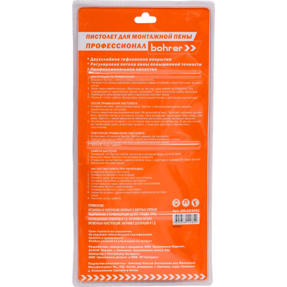Пистолет для монтажной пены BOHRER Профессионал двухслойное тефлоновое покрытие, регулировка потока ПП-003001