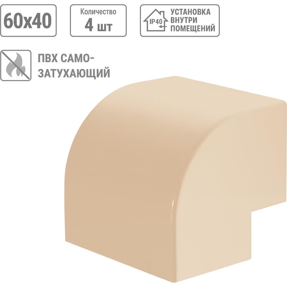 Высота 40 мм Длина 120 мм Материал ПВХ Ширина 60 мм Цвет сосна Тип внешний угол Вес нетто 0.157 кг Степень защиты IP40 Количество в упаковке 4 шт Температура эксплуатации от -40 до +70 °С Цвет RAL 1001 Палитра бежевый Температура монтажа от -15 до +60 °С Климатическое исполнение УХЛ1 Размер 60х40 мм Количество вводов 2 шт Высота кабель-канала 40 мм Ширина кабель-канала 60 мм Количество отсеков 1 шт Изменяемый угол нет