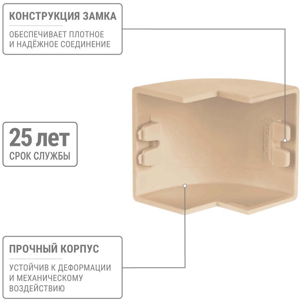 Высота 16 мм Длина 50 мм Материал ПВХ Ширина 25 мм Цвет сосна Тип внешний угол Вес нетто 0.024 кг Степень защиты IP40 Количество в упаковке 4 шт Температура эксплуатации от -40 до +70 °С Цвет RAL 1001 Палитра бежевый Температура монтажа от -15 до +60 °С Климатическое исполнение УХЛ1 Размер 25х16 мм Количество вводов 2 шт Высота кабель-канала 16 мм Ширина кабель-канала 25 мм Количество отсеков 1 шт Изменяемый угол нет