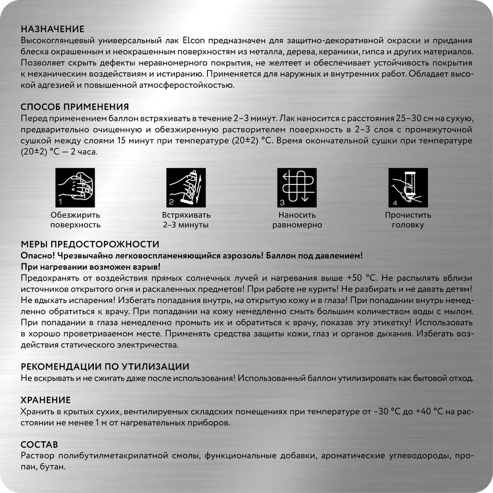 Аэрозольный лак в баллончике для металла, дерева, пластика Elcon быстросохнущий, водостойкий, износостойкий, бесцветный, глянцевый, аэрозоль, 520 мл 00-00462310