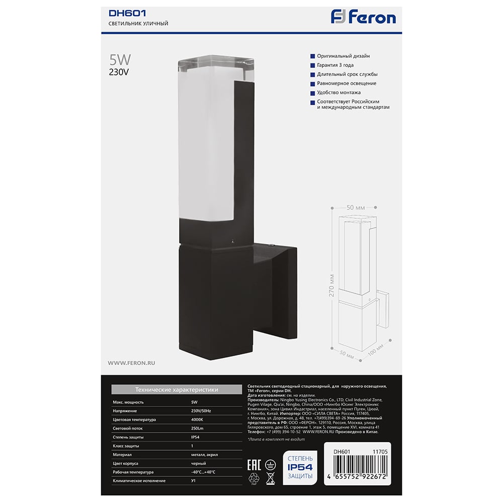 Уличный светодиодный светильник FERON DH601, 5W, 250Lm, 4000K, черный, 11705