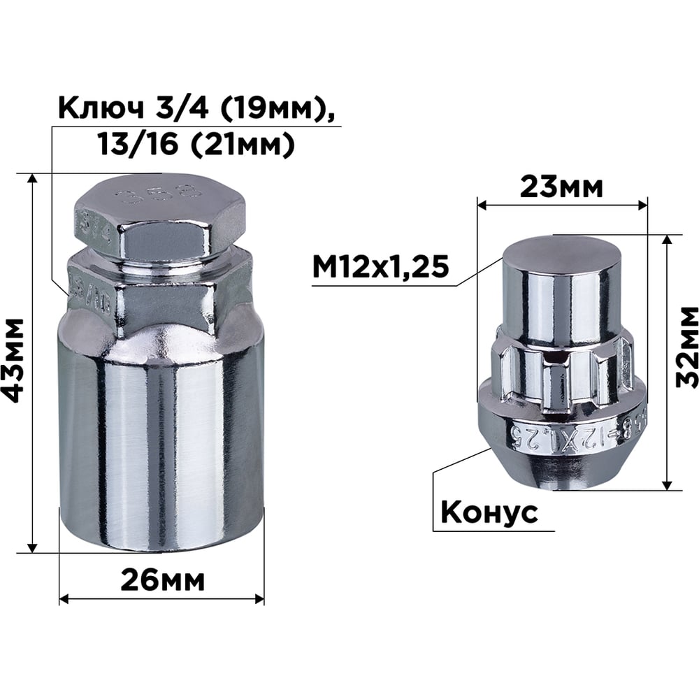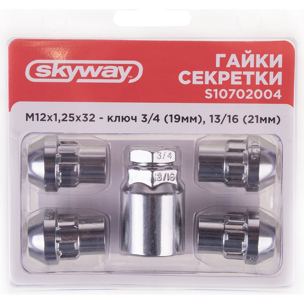Гайки секретки М12x1.25, 32 мм, конус закр 5 луч 1 кл, хром 004, 4 шт SKYWAY S10702004